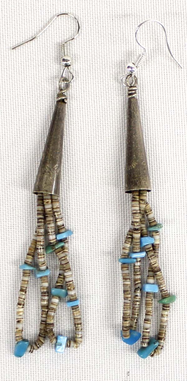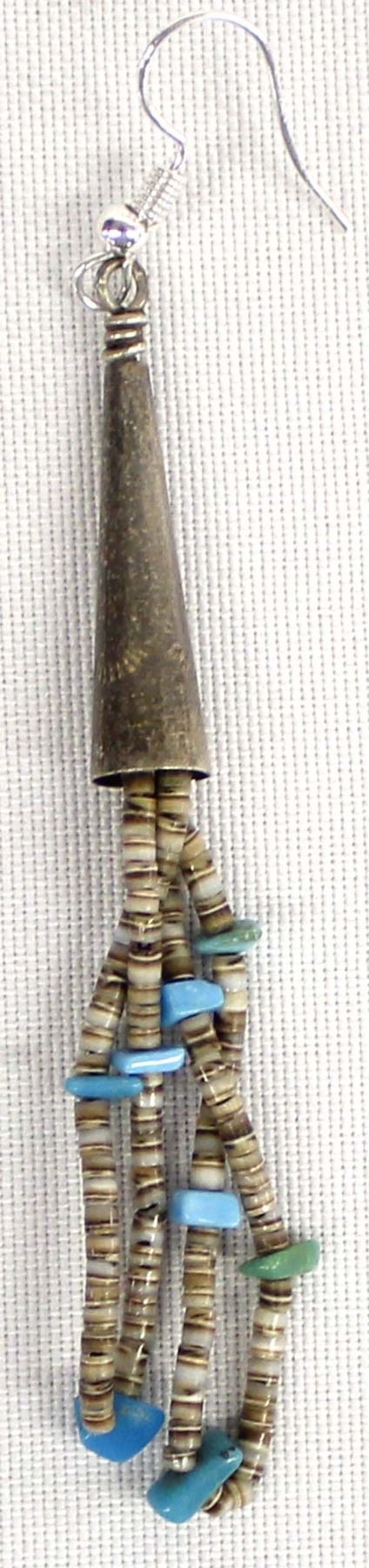 Native American Navajo Turquoise and Shell Heishi Earrings, sterling cones, measures 3.25''L
