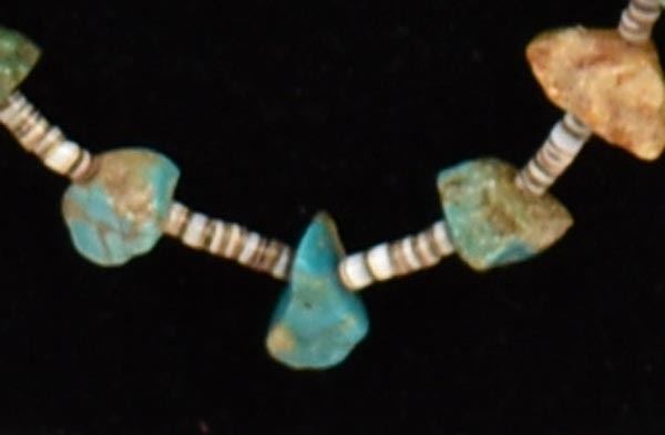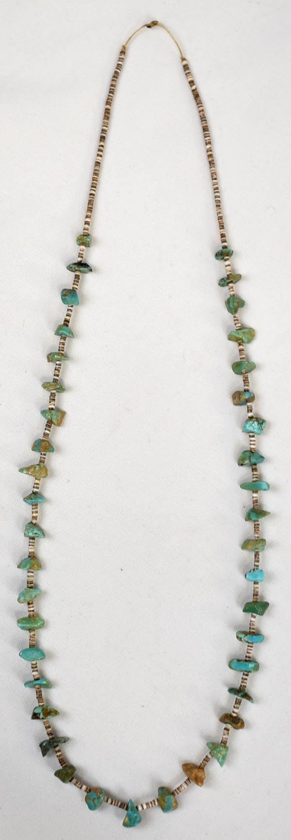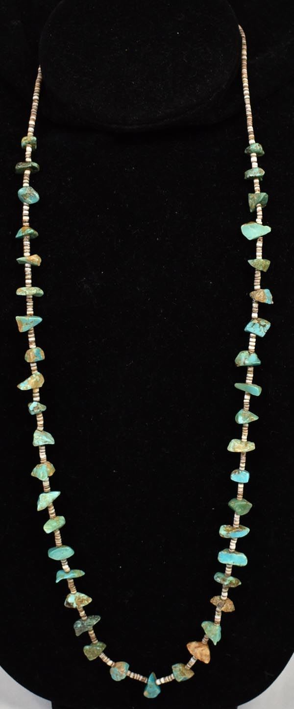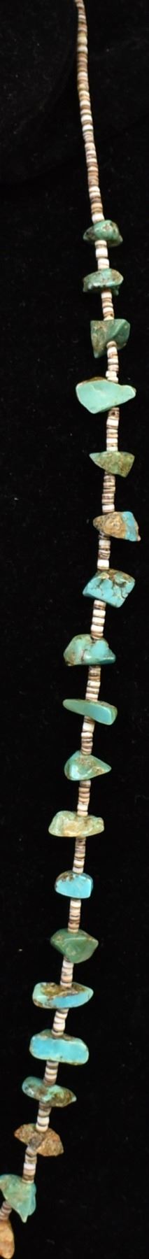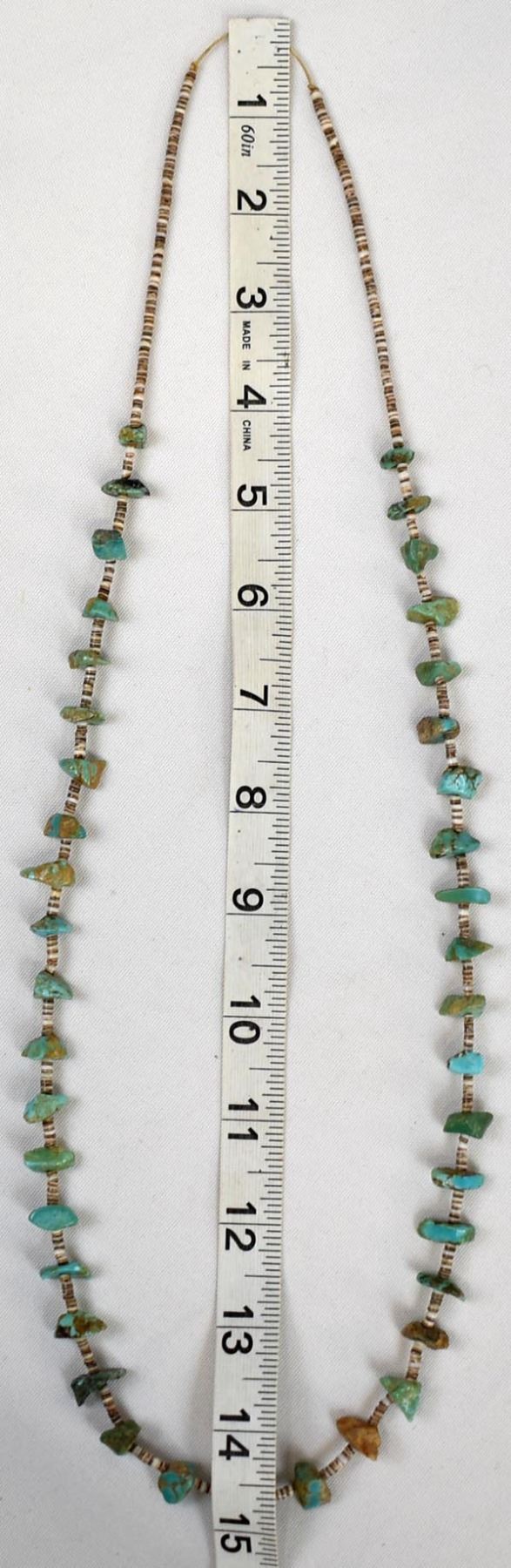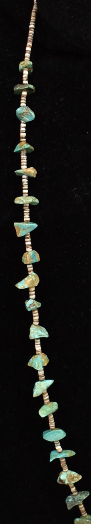 Native American Navajo Turquoise and Shell Heishi Necklace, string tied, measures 30"L end to end, beautiful green turquoise