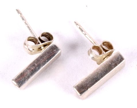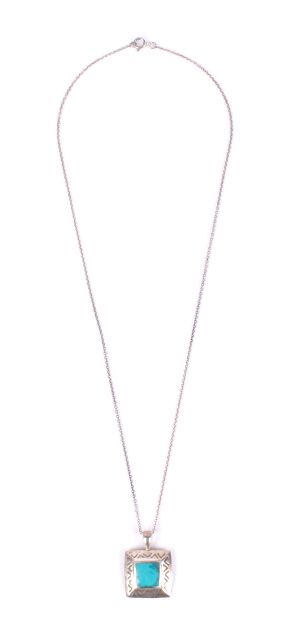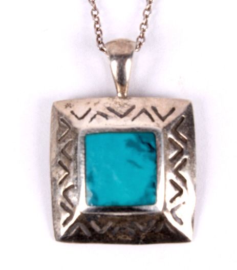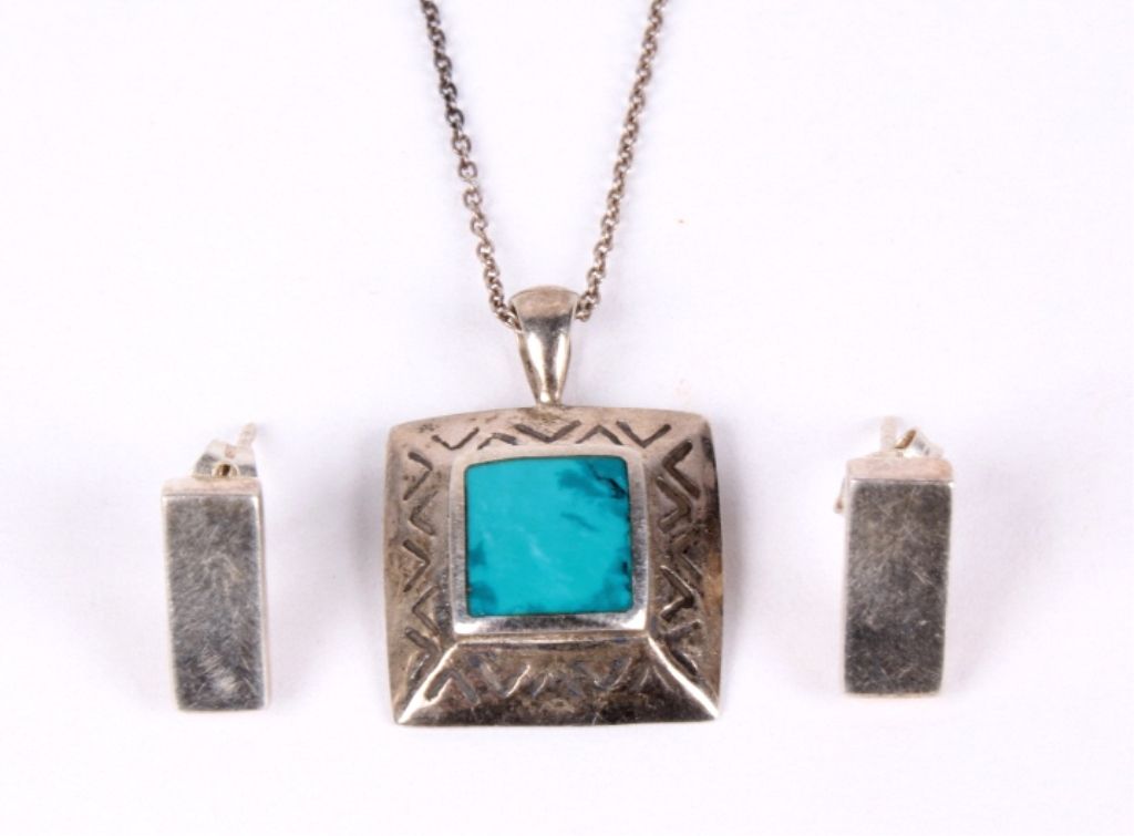 This lot features a Navajo sterling silver and turquoise necklace with matching sterling silver earrings. The pendant is .75" x .75" and the chain is 17'. The earrings measure .25" x .5".