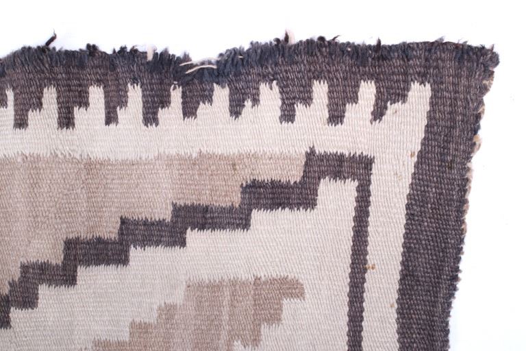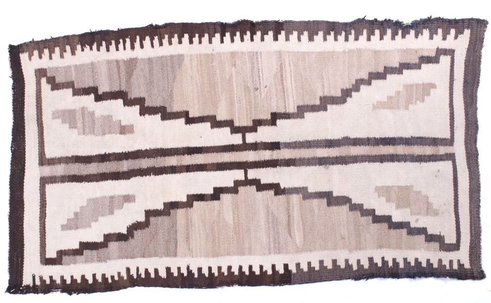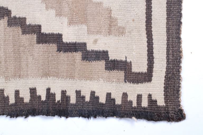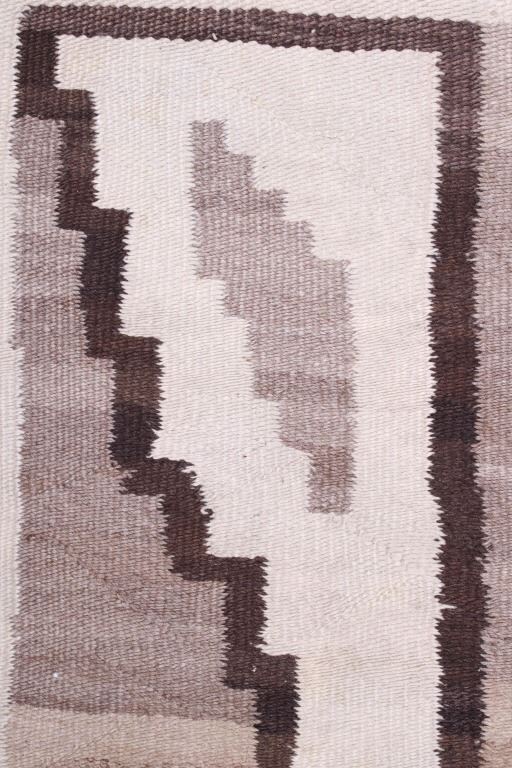 For your consideration is this wonderful Navajo Two Gray Hills Storm Pattern rug, circa 1930. The rug features rich, warm earth tones of brown, beige and cream. The traditional Storm Pattern is divided lengthwise by two bands of brown surrounding a middle band of cream. The outside border features a saw-tooth design in brown; each end is capped with a brown/ beige band. This rug is in very good condition for its age and has a tight weave; it does have some minor fraying along the edges. The measurements of this rug are 51 1/2" x 29".
