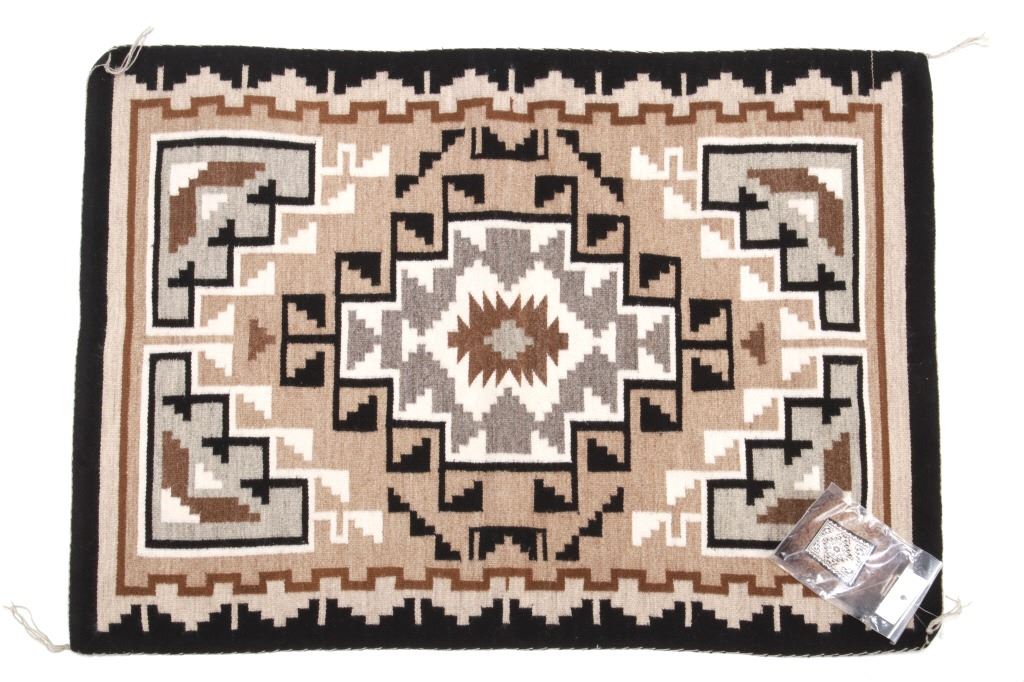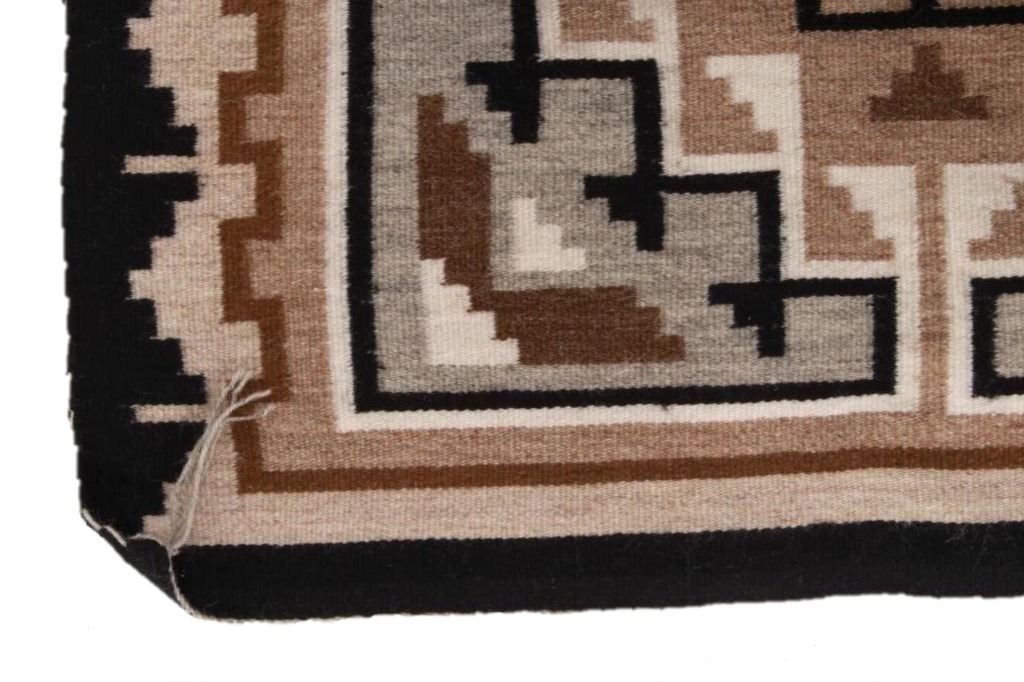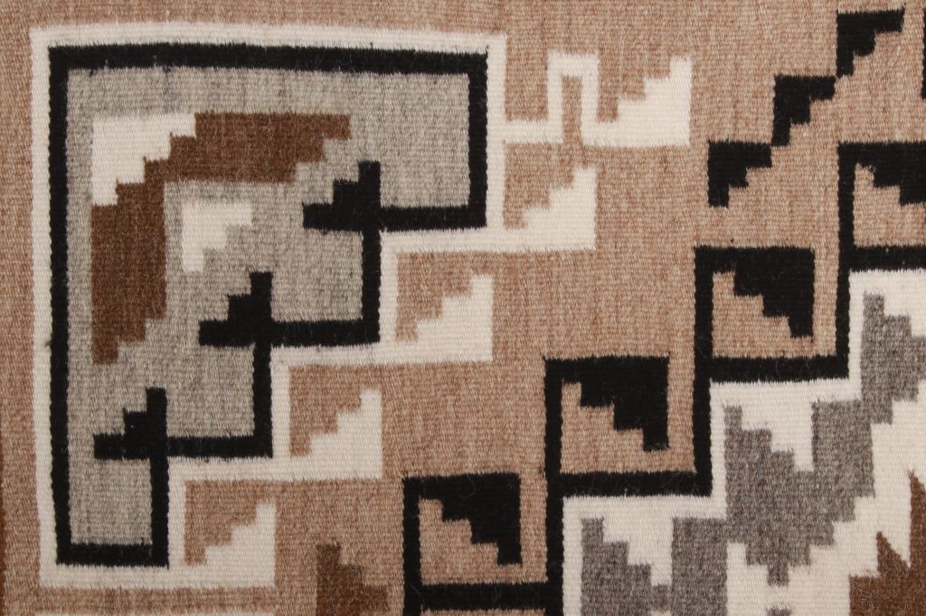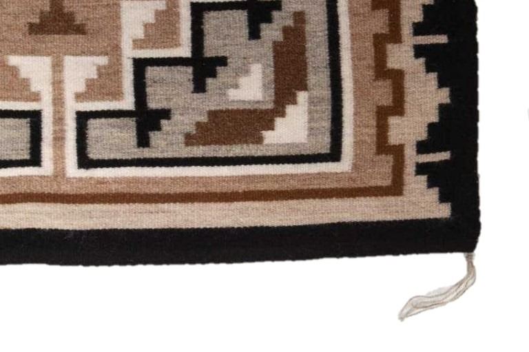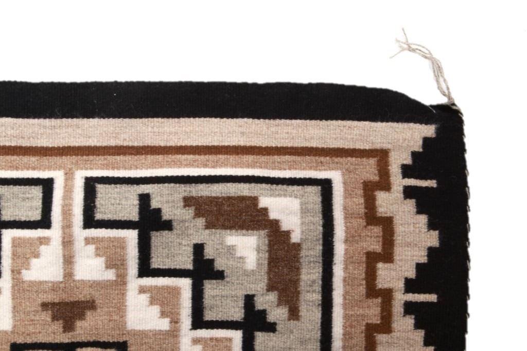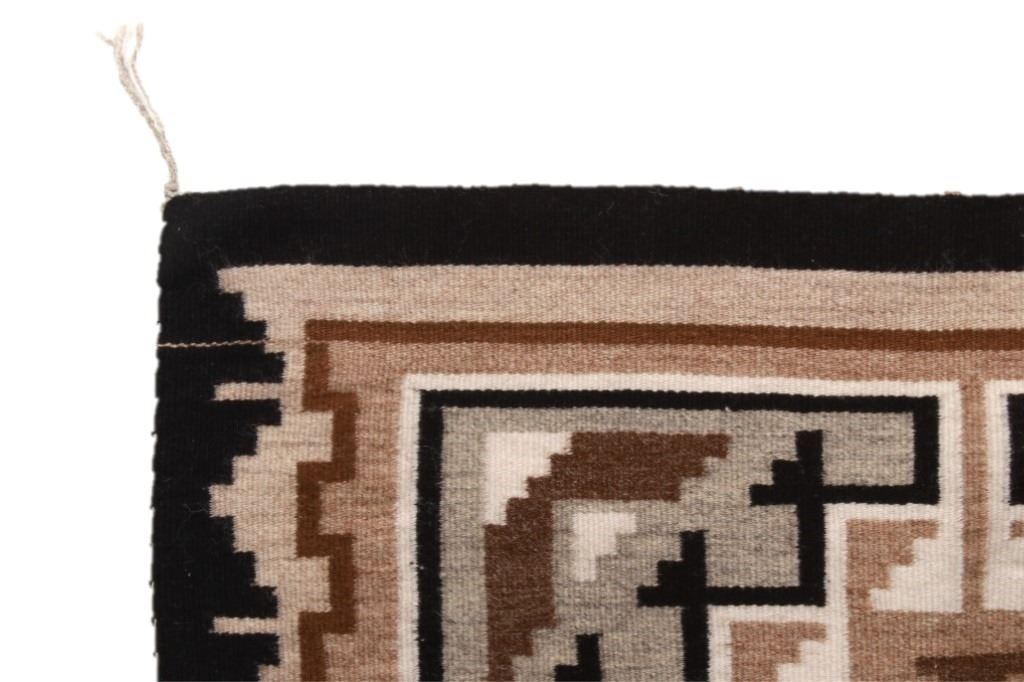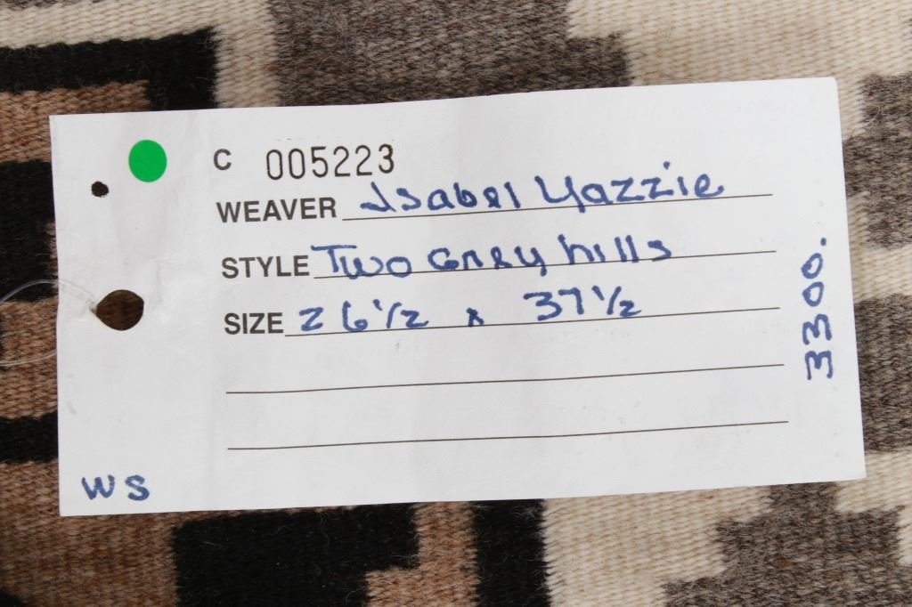 This is a phenomenal finely woven rug from master Navajo weaver Isabel Yazzie with a wonderful Two Grey Hills pattern dating to circa 1980-1990’s with a gallery tag. The rug is accompanied with an original Toh-Atin Indian Arts and Crafts Durango, Colorado tag marked with Isabel Yazzie, Two Grey Hills, 26 ½ x 37 1/2, and price of $3,300 (also shown is a Kodak photograph of the rug presumably dated 1996). This example shows a rich and iconic Two Grey Hills pattern with fine details in grey, multiple tans and browns, black and white / cream. The piece is in incredible well-preserved condition with little to no loss to the weave, bright rich coloring, no visible bleeding, and soft wool with a tight weave. The rug has an amazing tightly woven knot count of approximately 336 knots per square inch (28x12). Other Isabel Yazzie examples are described as being handspun and vegetal dyed wool. Provenance: The piece has been in a phenomenal Navajo weavings collection since the 1990’s in Billings, Montana and shown at the Toh-Atin gallery. Measures overall 26.5” by 37.5” without the tassels and 34” by 44” with them. This is the highest knot count Navajo of the sale.