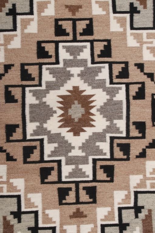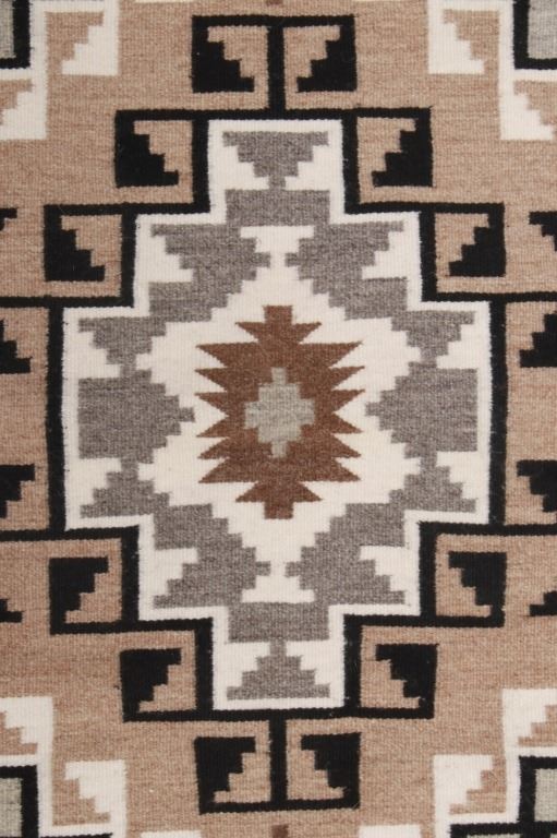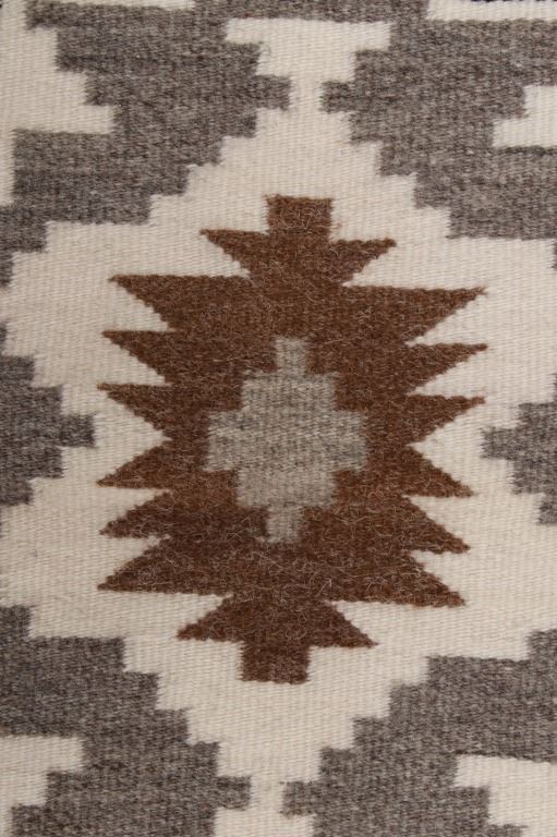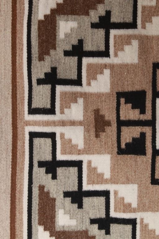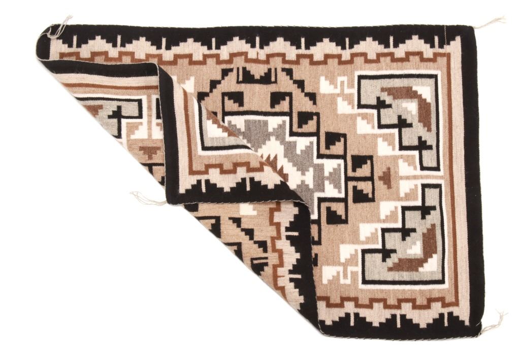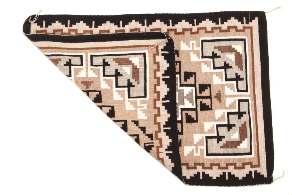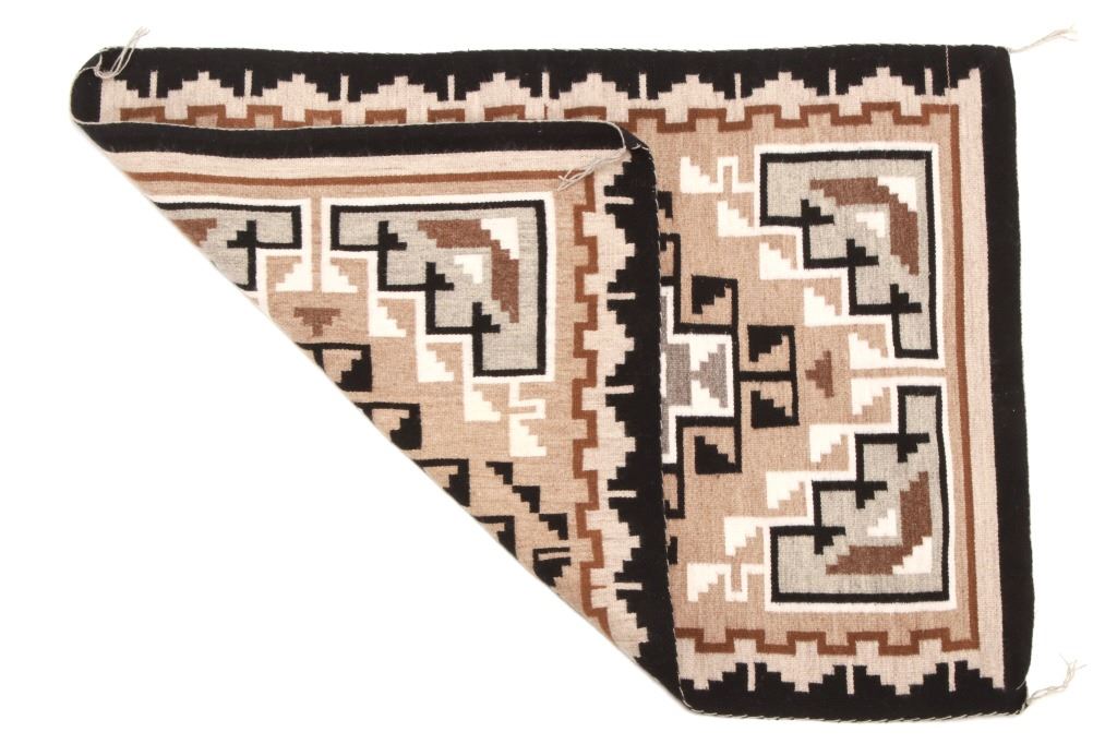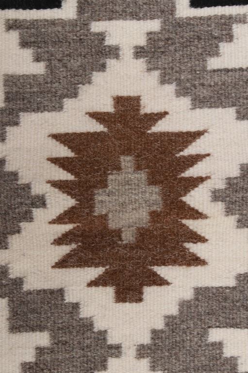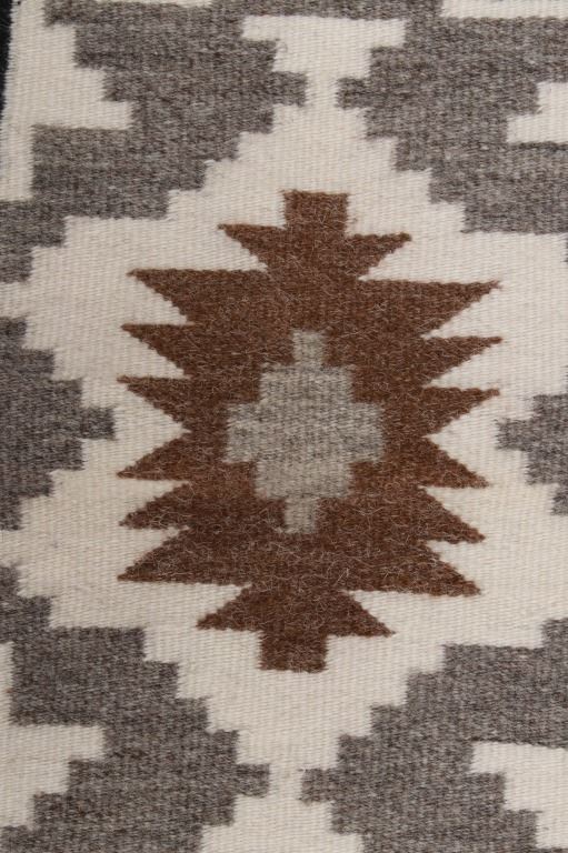 This is a phenomenal finely woven rug from master Navajo weaver Isabel Yazzie with a wonderful Two Grey Hills pattern dating to circa 1980-1990’s with a gallery tag. The rug is accompanied with an original Toh-Atin Indian Arts and Crafts Durango, Colorado tag marked with Isabel Yazzie, Two Grey Hills, 26 ½ x 37 1/2, and price of $3,300 (also shown is a Kodak photograph of the rug presumably dated 1996). This example shows a rich and iconic Two Grey Hills pattern with fine details in grey, multiple tans and browns, black and white / cream. The piece is in incredible well-preserved condition with little to no loss to the weave, bright rich coloring, no visible bleeding, and soft wool with a tight weave. The rug has an amazing tightly woven knot count of approximately 336 knots per square inch (28x12). Other Isabel Yazzie examples are described as being handspun and vegetal dyed wool. Provenance: The piece has been in a phenomenal Navajo weavings collection since the 1990’s in Billings, Montana and shown at the Toh-Atin gallery. Measures overall 26.5” by 37.5” without the tassels and 34” by 44” with them. This is the highest knot count Navajo of the sale.