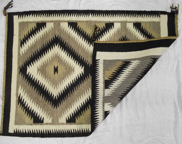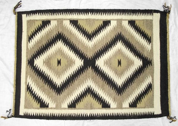 From the Collection of Nick and Suzanne Nicholas we have a beautiful Navajo Two Grey Hills Rug, tightly woven serrated diamond rug in cream, black, gray, and white with a black serrated border, tassels are present, measures 46 in. x 32 in., good condition for age