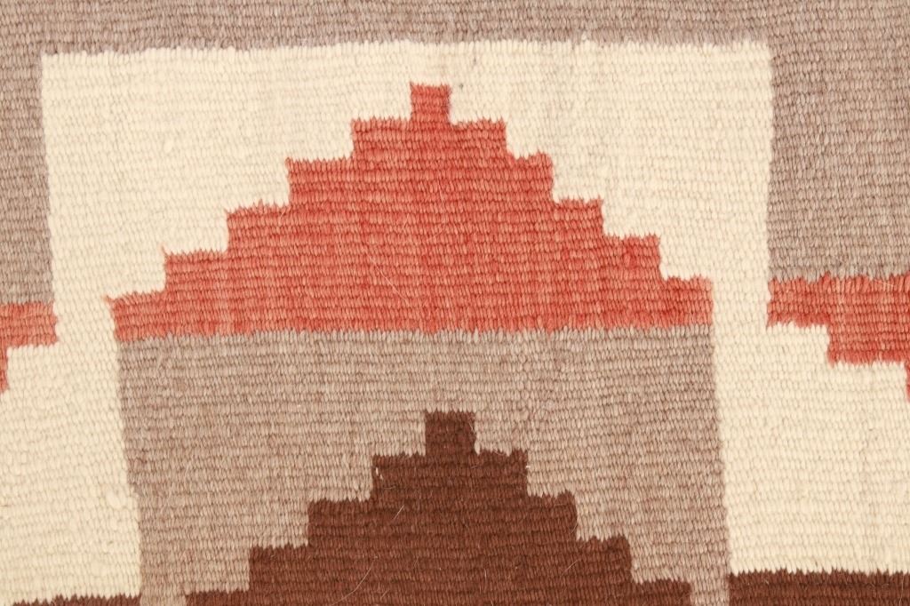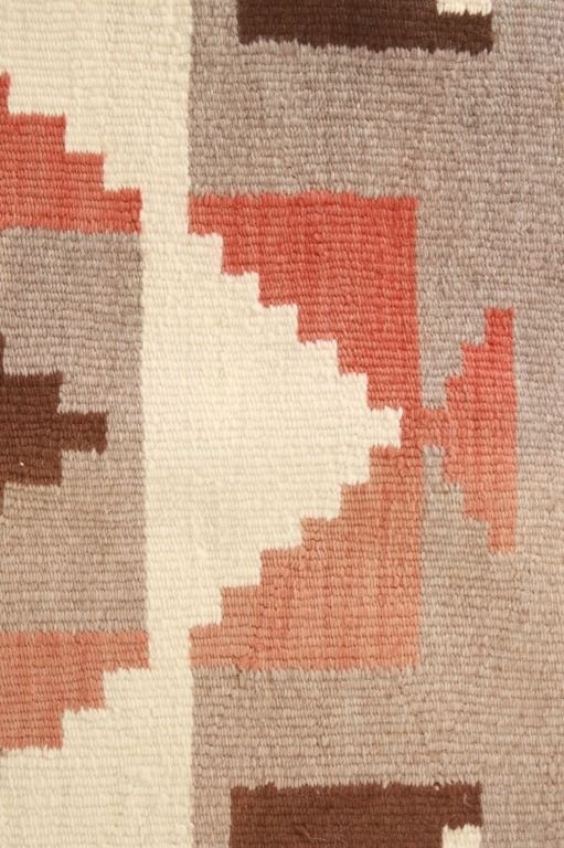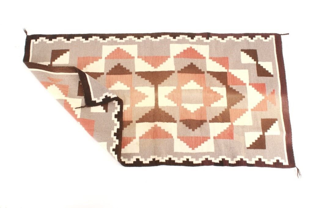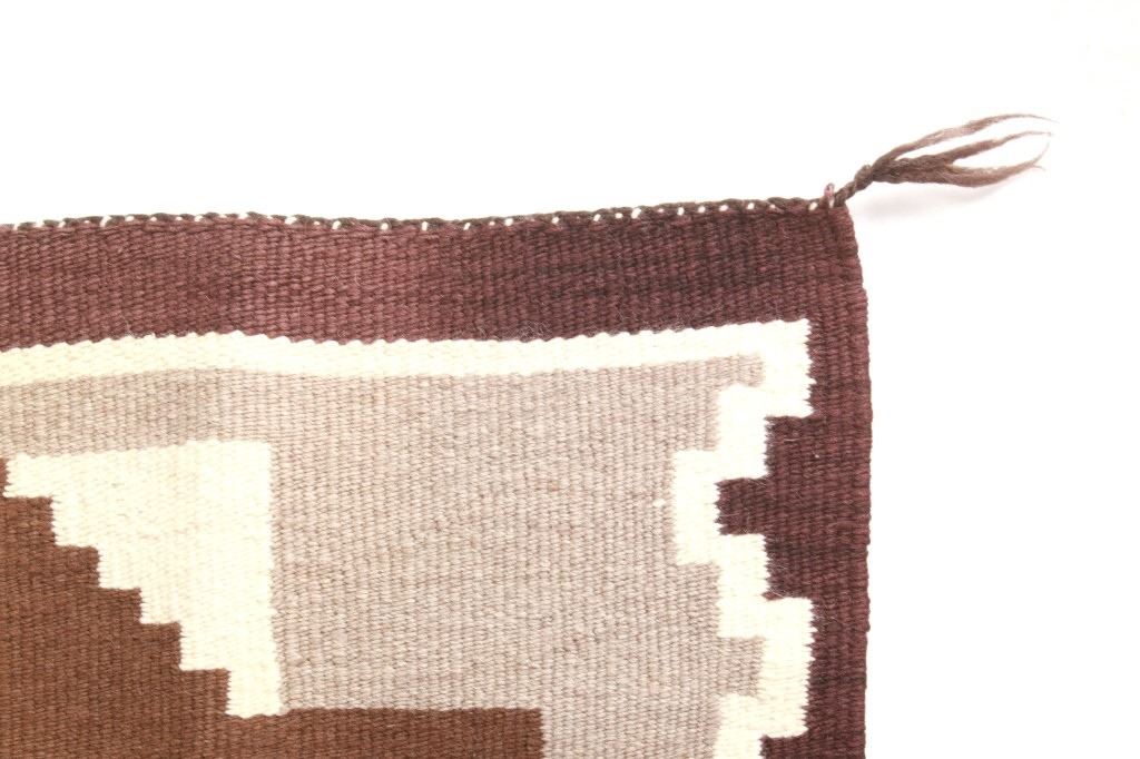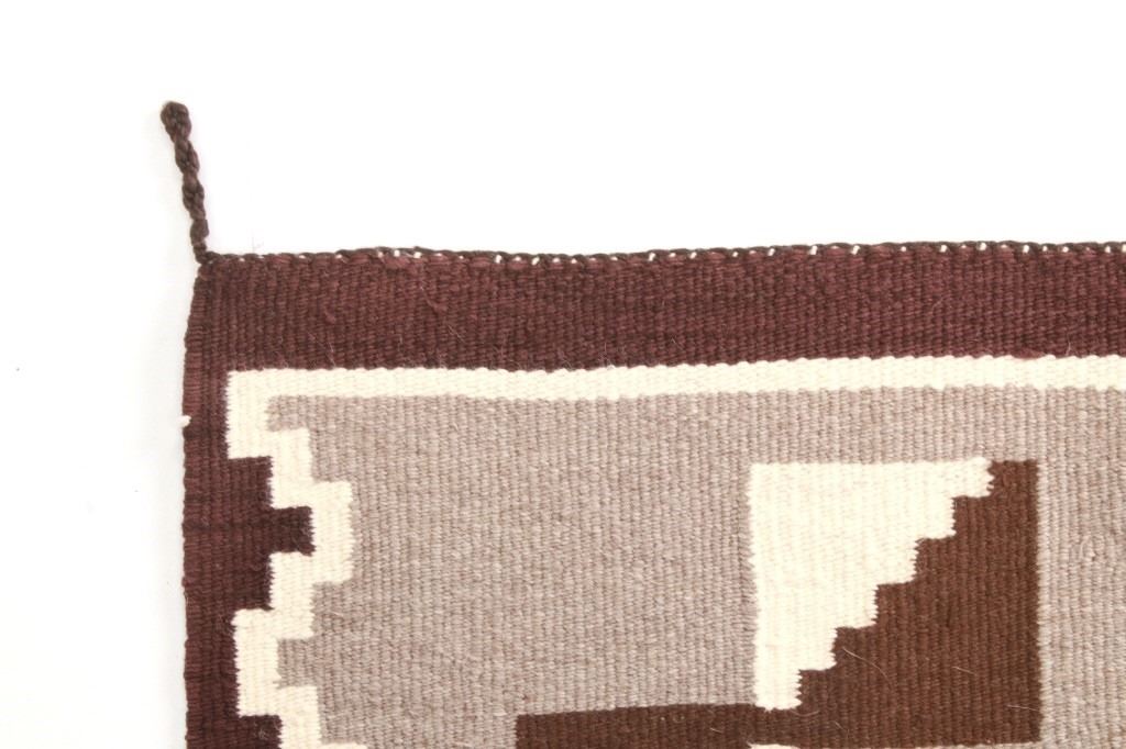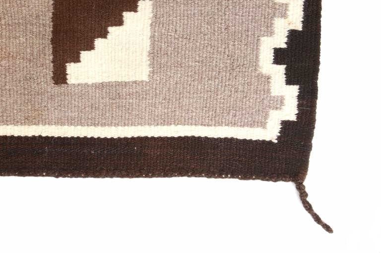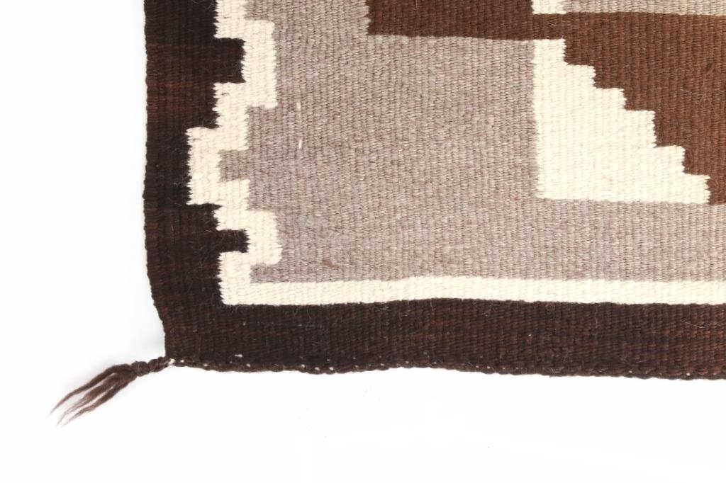 Featured in this lot is this Navajo Two Grey Hills trading post rug circa 1930's. The rug shows a wonderfully and professionally hand woven construction with a black border and grey field with a large multi layered medallion in the center with colors such as reddish brown, brown, and off white. This regional style was started in 1914 by George Bloomfield and Ed Davis at the Toadlena and Two Grey Hills Trading Post. These Navajo rugs are characterized by natural browns, tan, gray, ivory, white, and black. It is not unusual for the blacks to be oven-dyed. Very rarely small amounts of red, orange or blue are used. The patterns usually have a central diamond motif and intricate patterns. The Two Grey Hills weavings are noted for their high quality. The condition of this rug is good with some bleeding denoting some age to the rug and that it was naturally dyed but otherwise shows good overall condition. The measurements of this rug are 74 1/4" x 39".