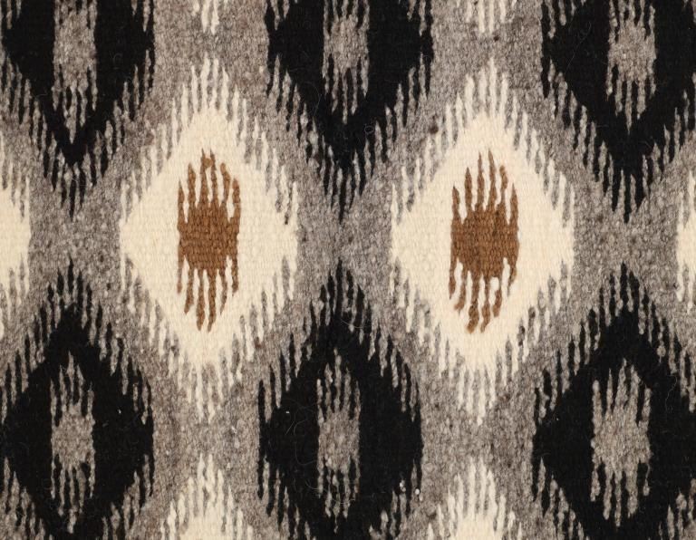 Featured in this lot is this Navajo Two Grey Hills Trading Post rug circa 1950's. The rug features a wonderfully and professionally crafted wool construction that shows a Two Grey Hills design with stepped decoration with a black border around all four corners with small medallions of light brown, black, and grey to a off white field. The condition of this Navajo rug is well preserved with no obvious signs of damage and shows well preserved construction. The measurements of this rug is 26" x 19 1/2".