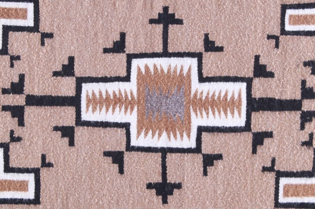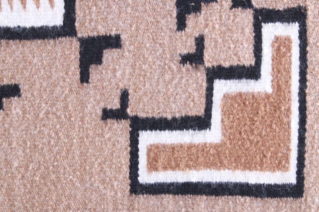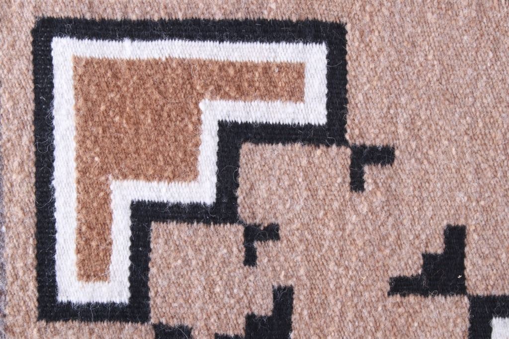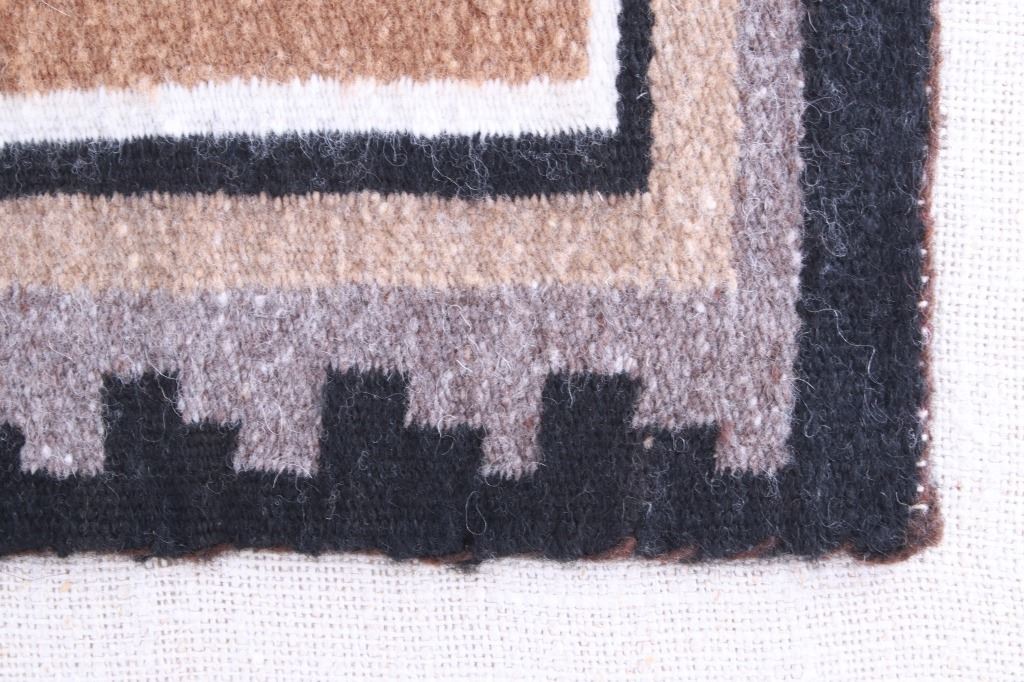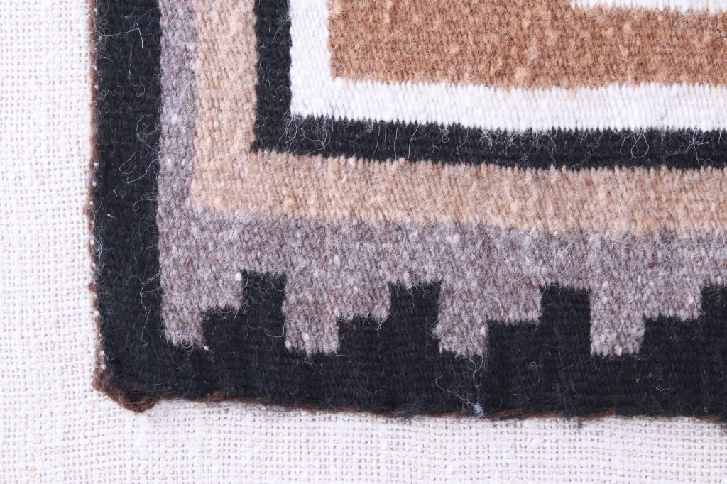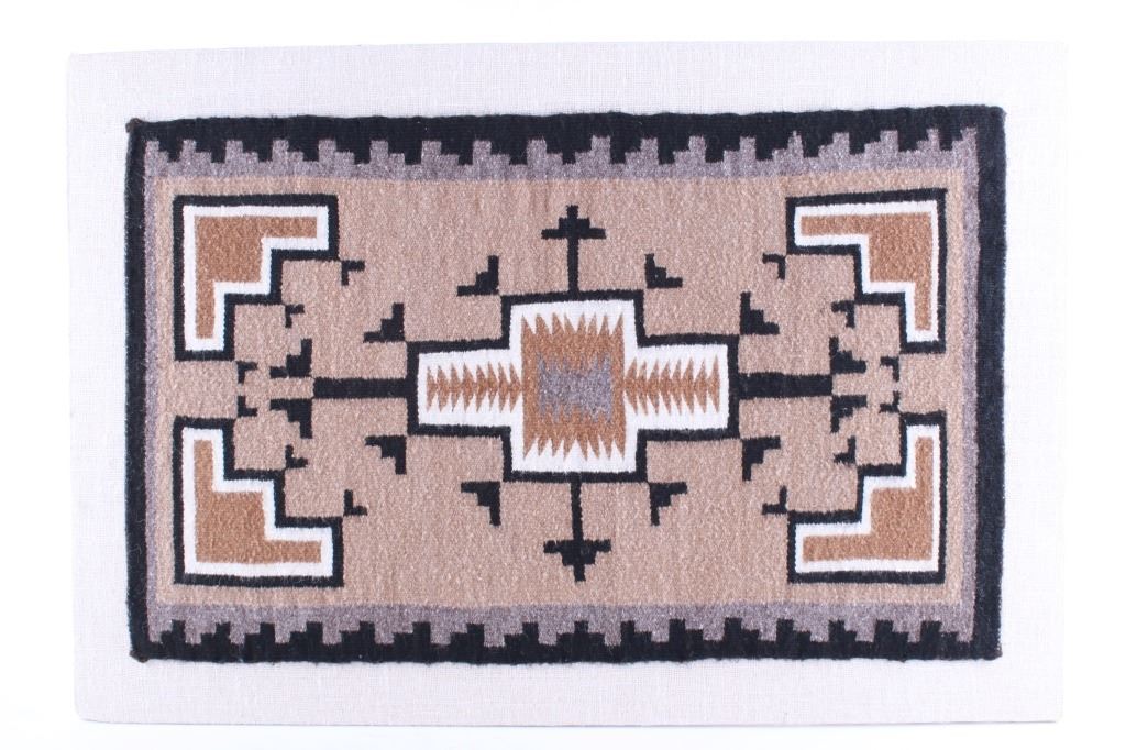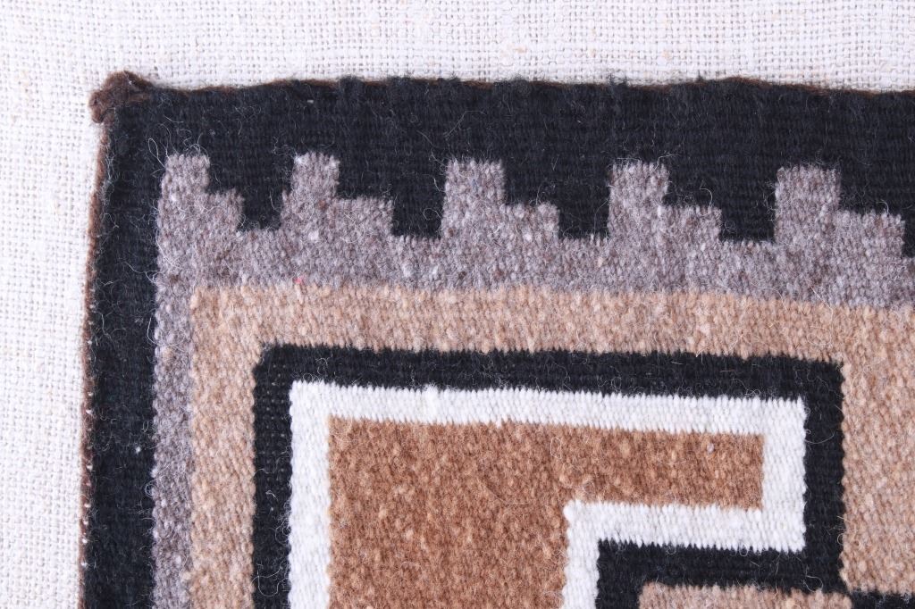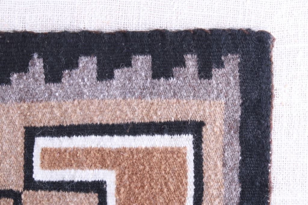 For your consideration is this Navajo Two Grey Hills vintage rug circa. 1960s. Two Grey Hills Navajo Indian Rugs are known as weavings in which no colored dyes were used. Instead, weavers carefully combed and spun different natural colors of yarn to yield a beautiful range of creamy whites, tans, browns, and greys. The weavers around Two Grey Hills developed very complex geometric patterns, usually based on a large, hooked, central diamond with multiple geometric borders. They also were known for very finely spun wool of small diameter which they used to make very thin, dense, and tightly woven rugs that are certainly the greatest technical achievements in the history of Navajo rug making. This rug shows a black stepped geometric pattern for the outside border with another border of grey. The inside field shows a beige / tan color with four corner chevrons showing a black outline, then white and finally a beige / tan interior. The middle of the rug shows a thick cross design with a black and white border, and geometric designs in the in the center in beige / tan and grey colors. The rug is set on a canvas background and mounted to a thick sturdy board. The rug shows a tight weave with a total thread count per square inch showing 192. The condition of this rug is good with no signs of damage and little to no wear present. The rug measures 32" L x 20" W. The entire piece measures 37 1/4" L x 25" W.