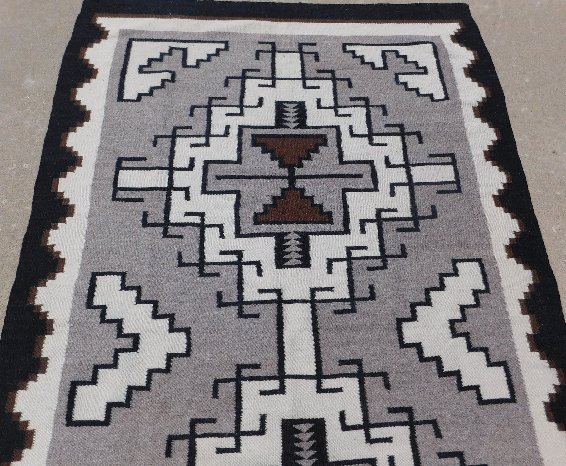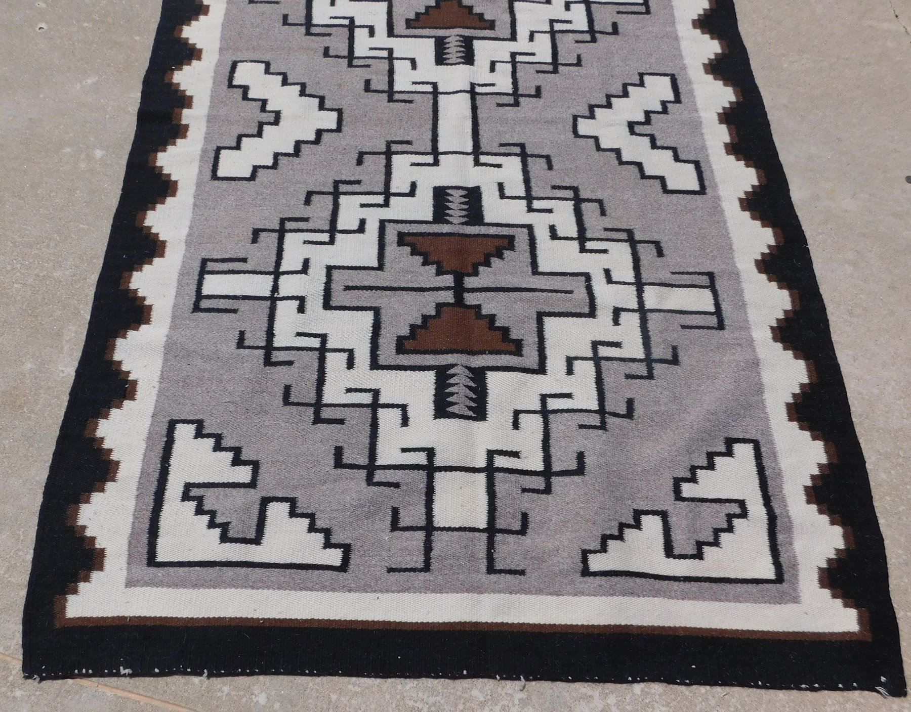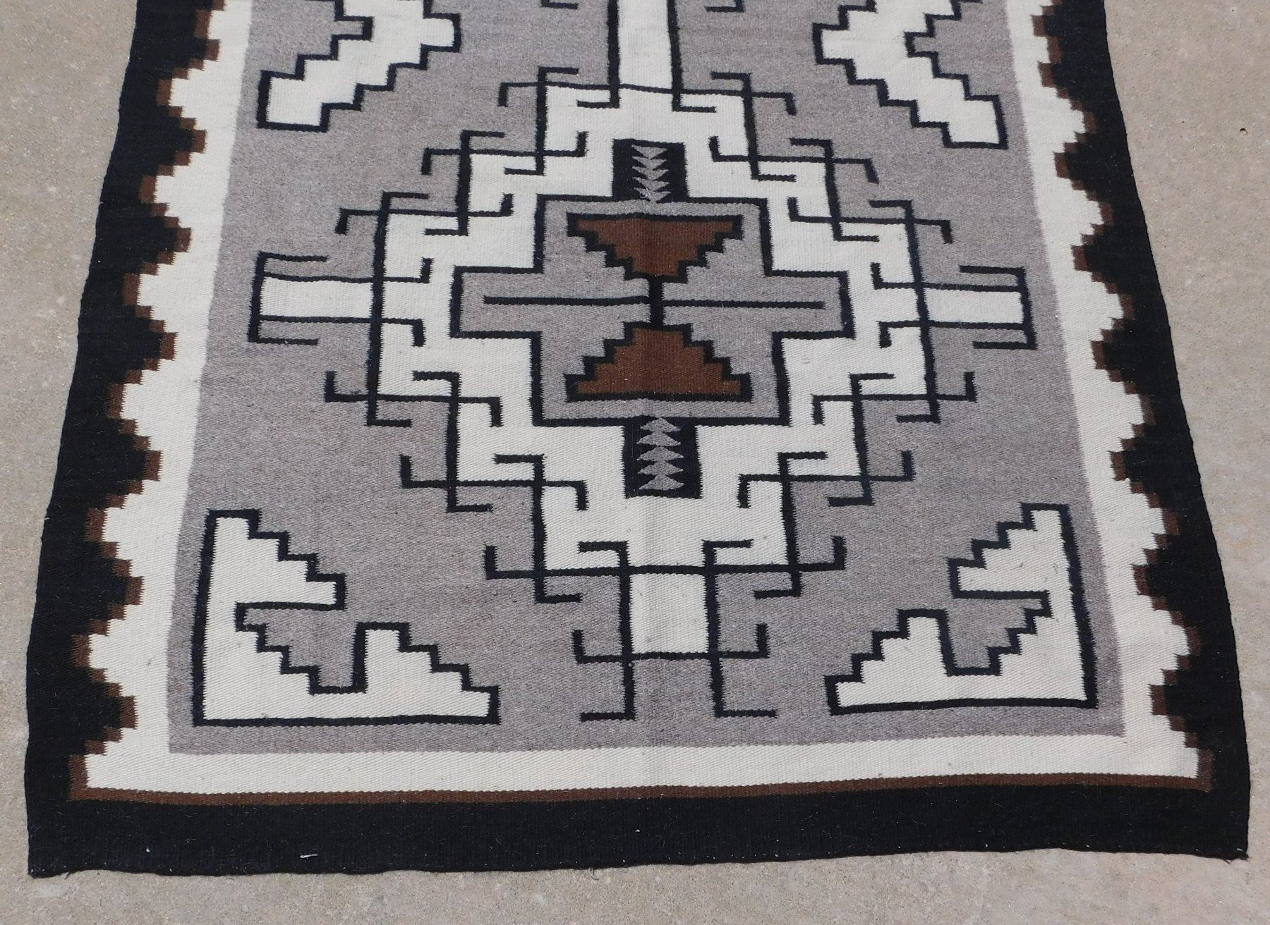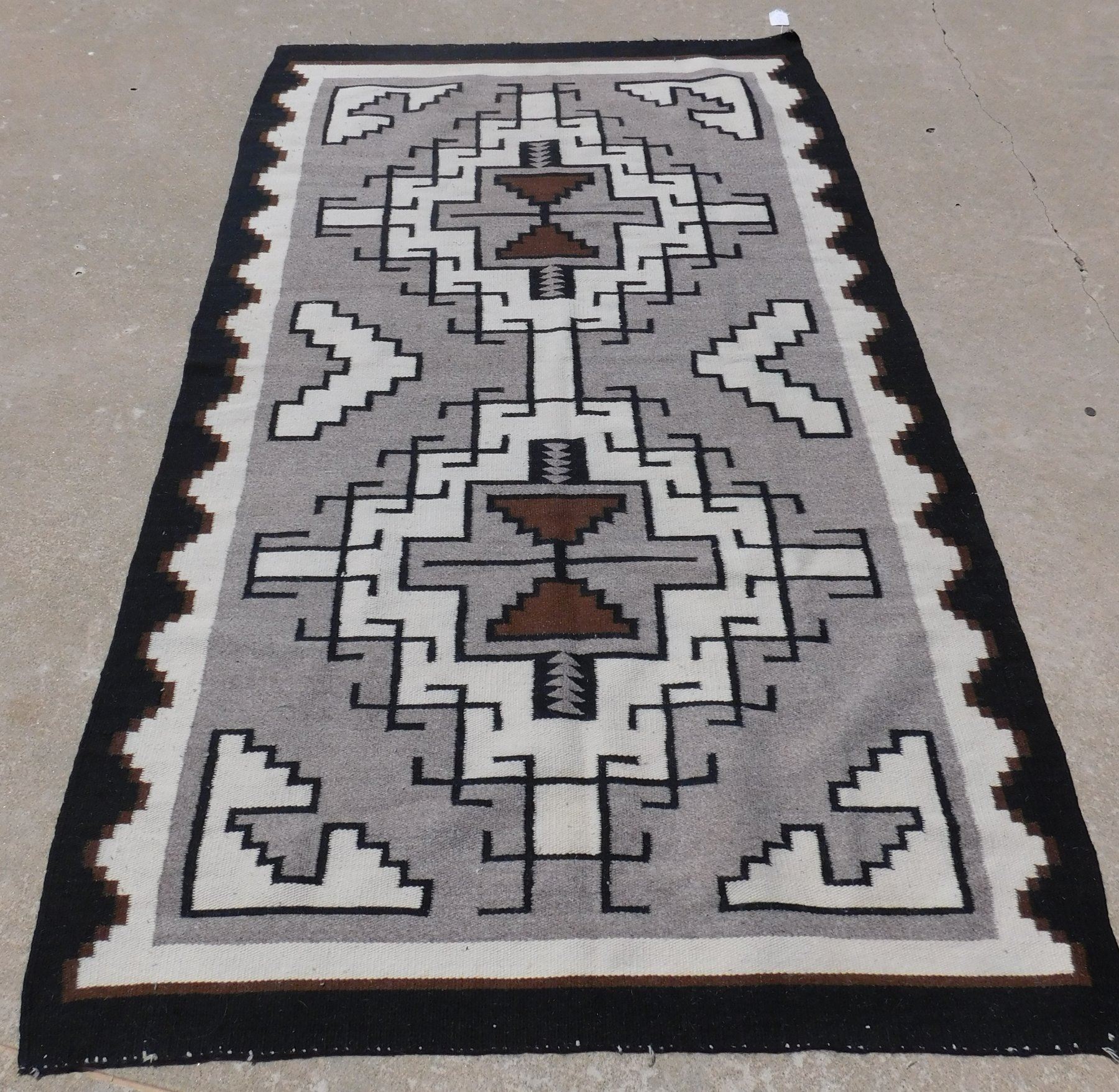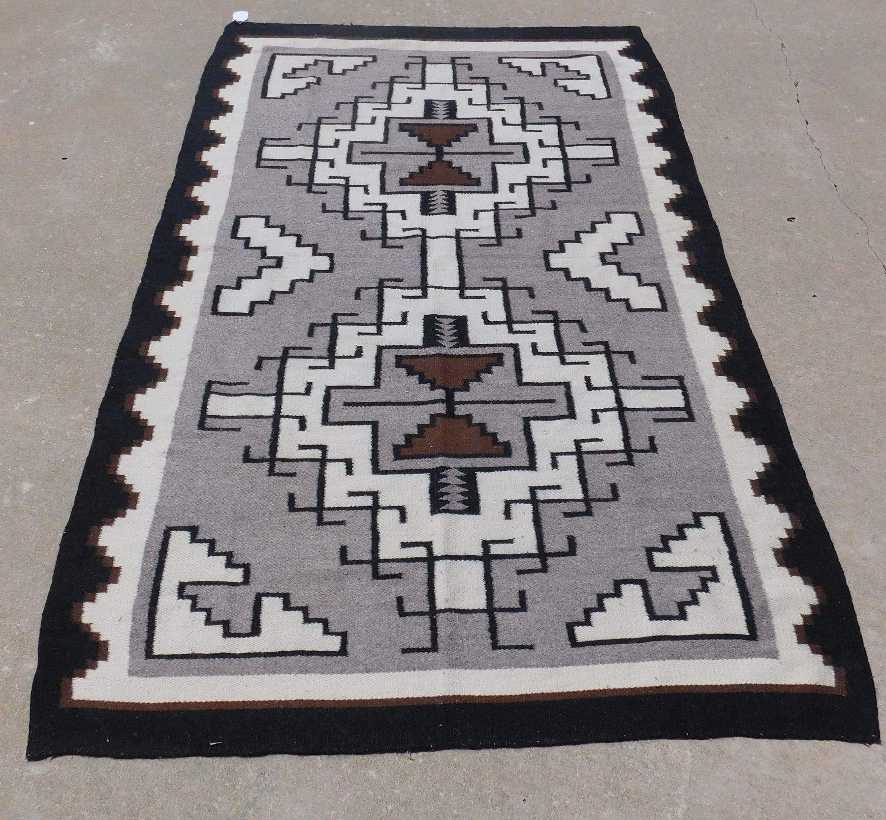 Navajo Two Grey Hills Weaving, c. 1950s. Made of wool and dye, the item measures 83.5" x 50.5". Navajo. Fantastic example of a fine, two grey hills rug. Condition: Good, see images. Shipping: $40.00 w/insurance and signature, due to size, weight and value.