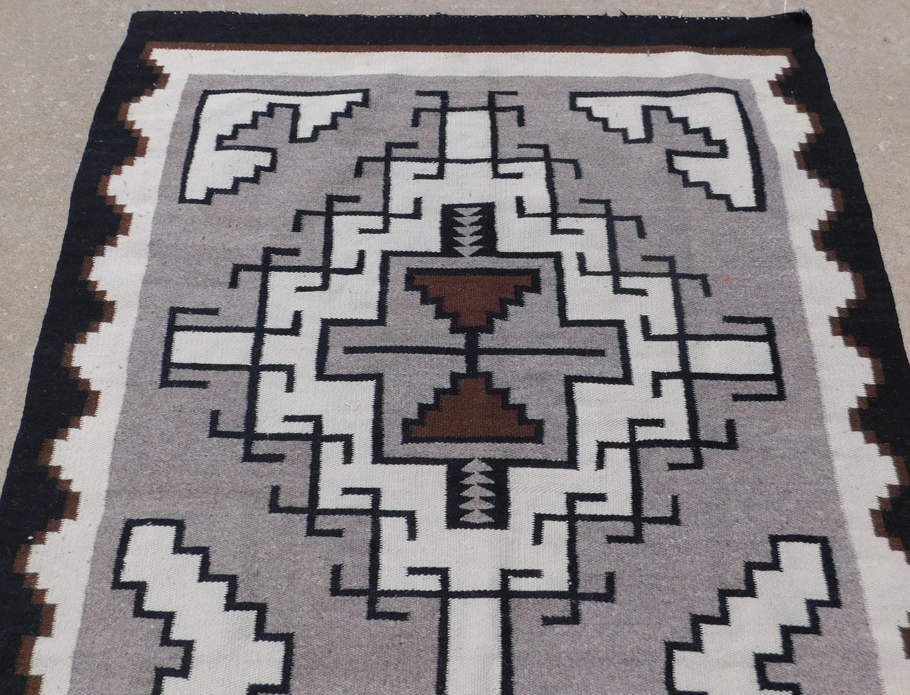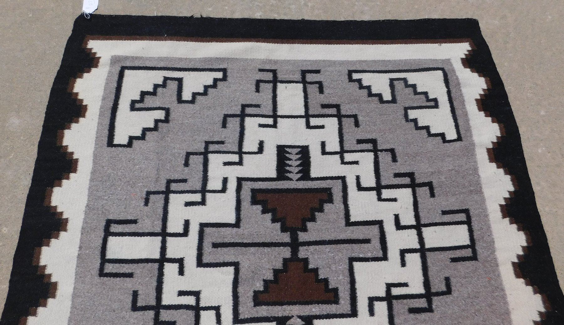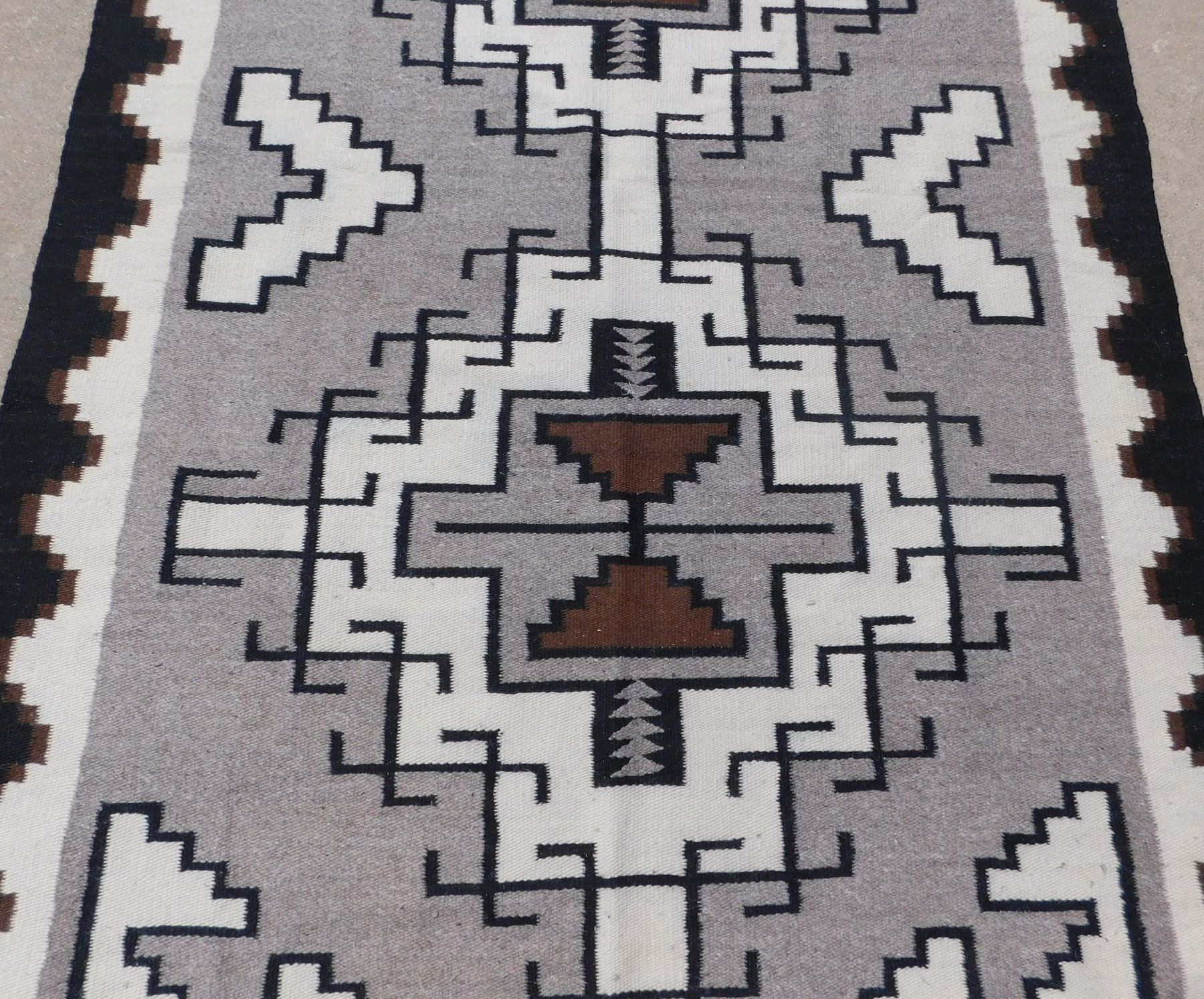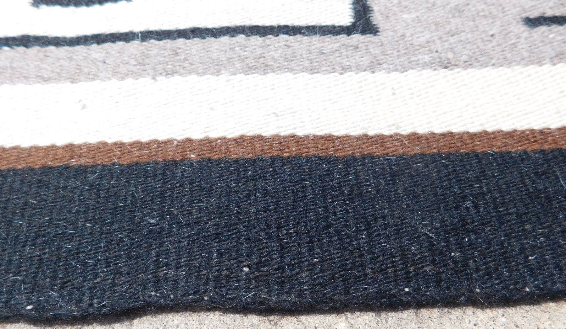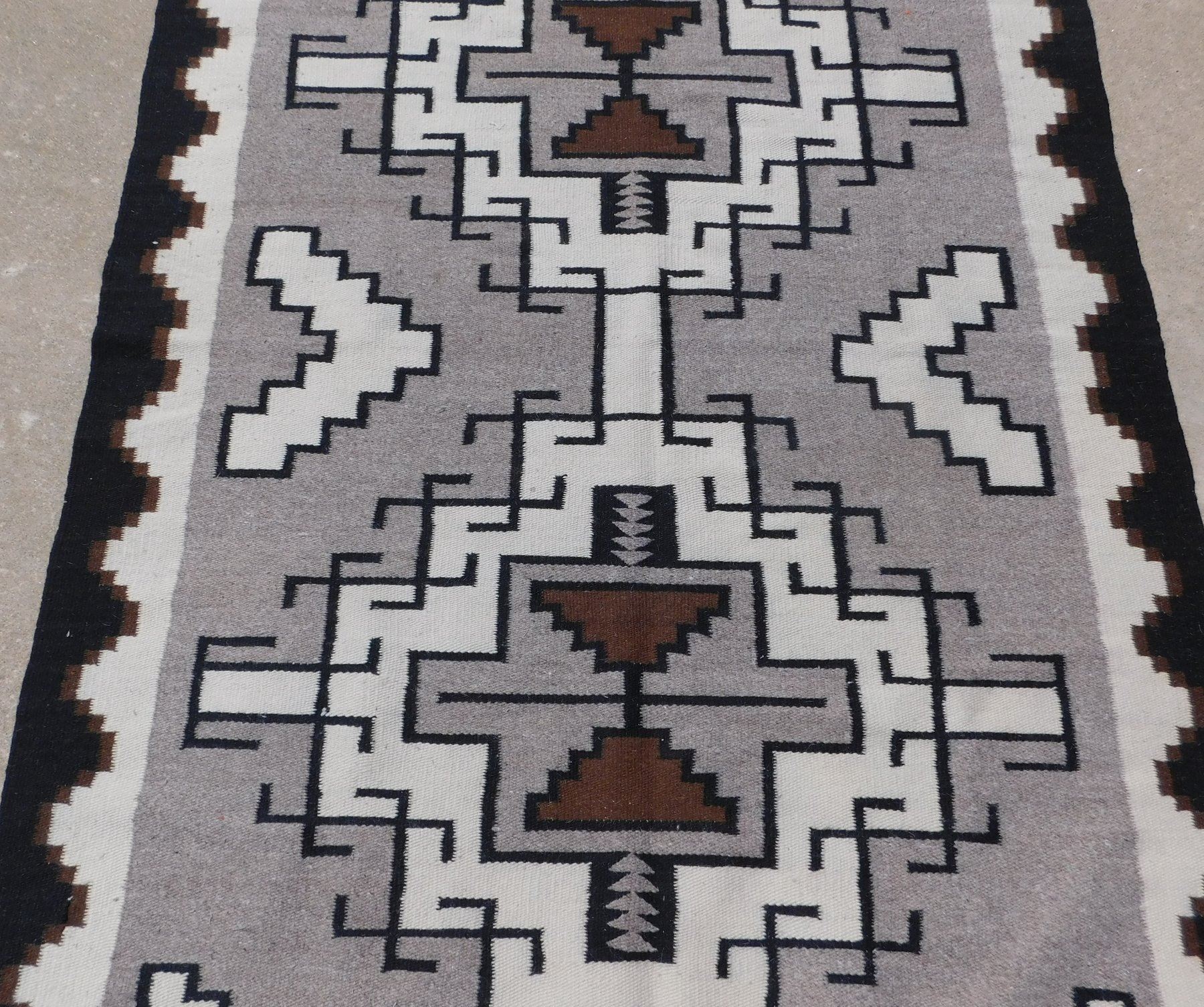 Navajo Two Grey Hills Weaving, c. 1950s. Made of wool and dye, the item measures 83.5" x 50.5". Navajo. Fantastic example of a fine, two grey hills rug. Condition: Good, see images. Shipping: $40.00 w/insurance and signature, due to size, weight and value.