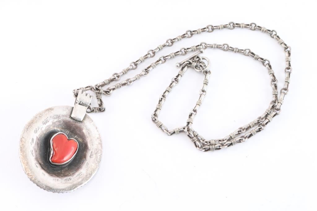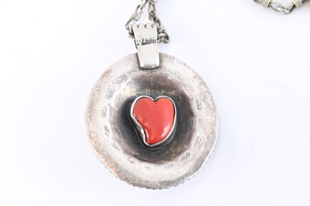 Turquoise concho style pendant on one side and reverse is a heart shaped coral pendant in a shadow box style, on high quality sterling chain. Pendant weighs 35 grams with stones, chain weighs 24 grams. All sterling silver.