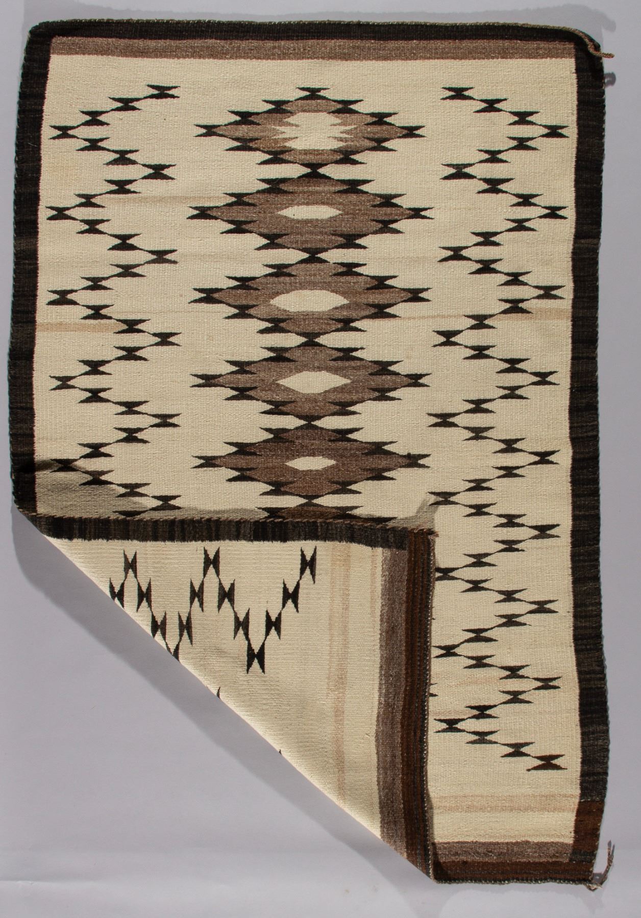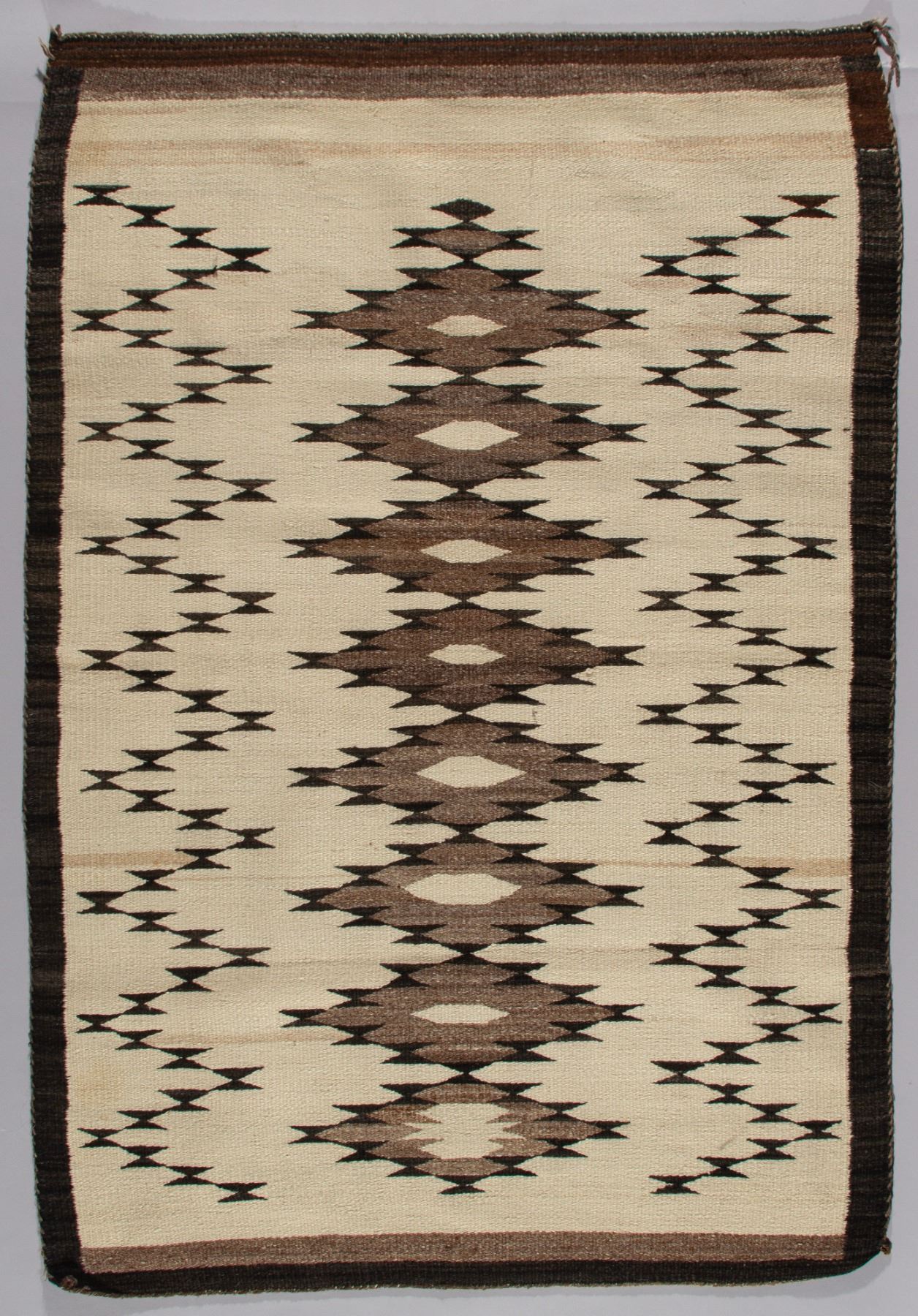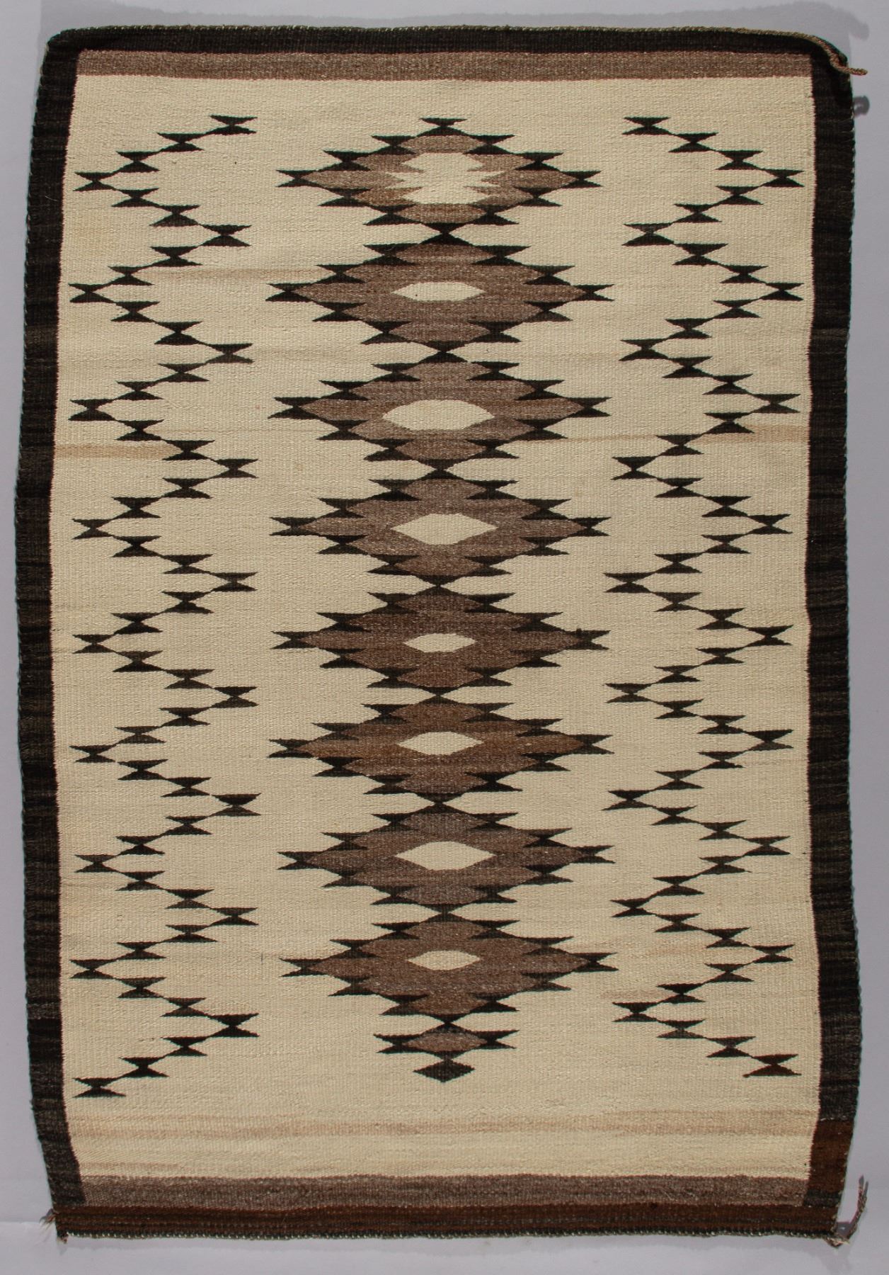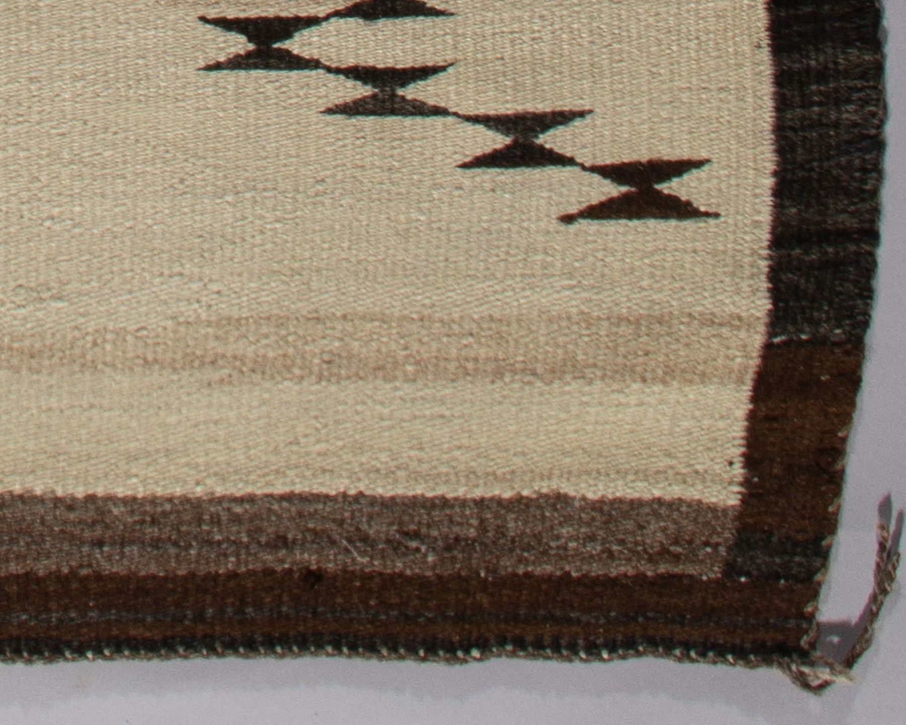 A classic Navajo weaving, circa 1920s, featuring a bold central band of serrated diamonds. This textile showcases the full spectrum of natural, undyed hand-spun fleece, with the cream-colored ground serving as a striking contrast to the geometric design executed in tones of natural gray, brown, and black. The intricate carding and spinning of the different wools result in a nuanced range of shades that lend depth and character to the piece. This textile is a fine example of early 20th-century Navajo weaving before the widespread use of aniline dyes, emphasizing the weaver's skill in using natural materials.