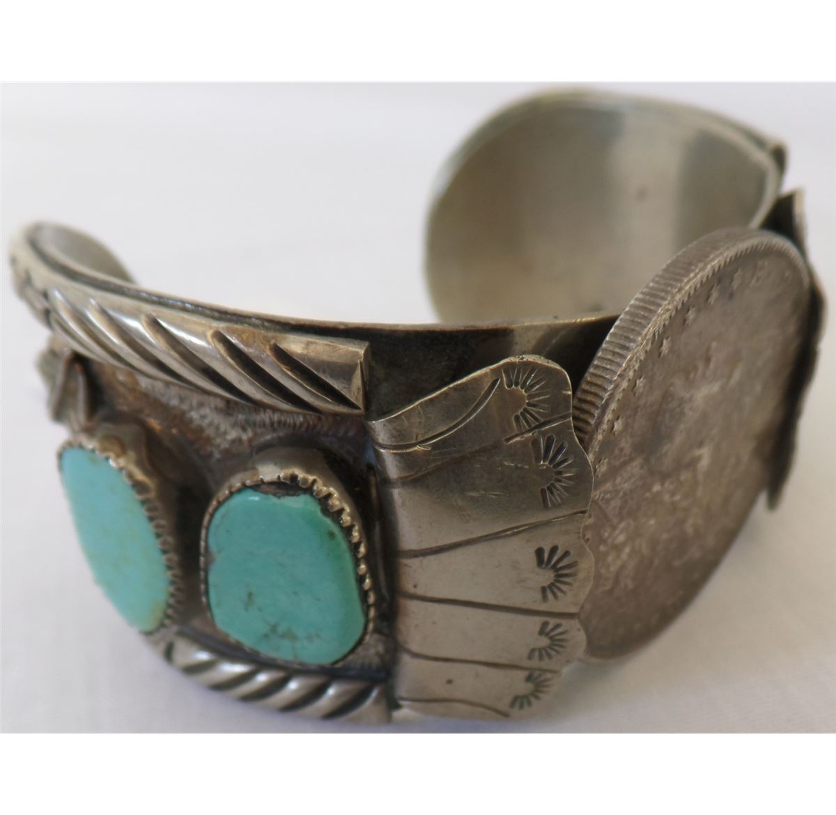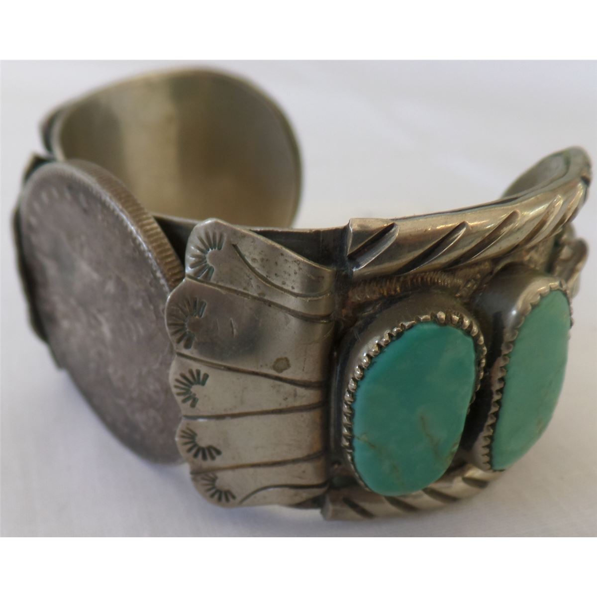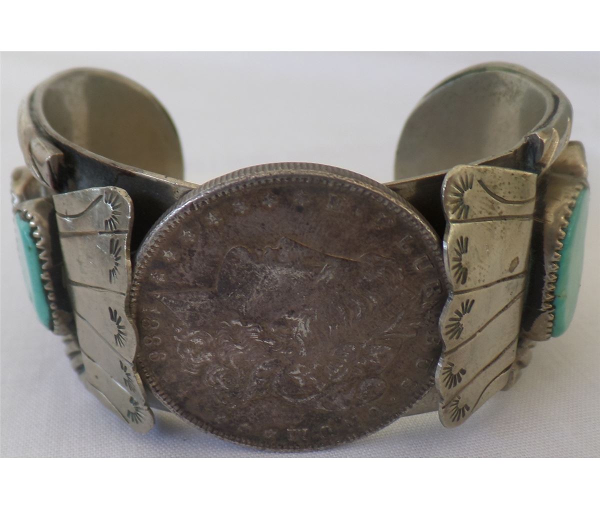 Navajo Watch Bracelet w/Silver Dollar. From the 1950s. Made of sterling silver, turquoise nuggets, and silver dollar. The silver dollar was found as part of a buried treasure in a wooden box in Alpine, CA. This would account for why the coin appears tarnished. Has a 2" opening, and measures 7.5" x 1.2" wide. Weighs approx. 125.5 grams. Navajo. Bracelet has silver leaf design on both ends. Condition: Nice, worn, see images. Shipping: 16.00