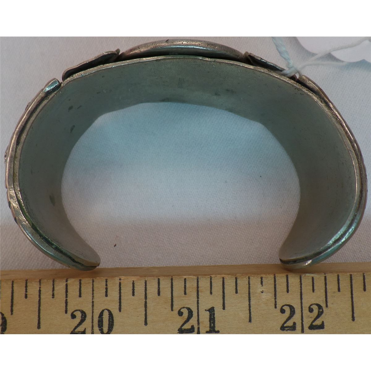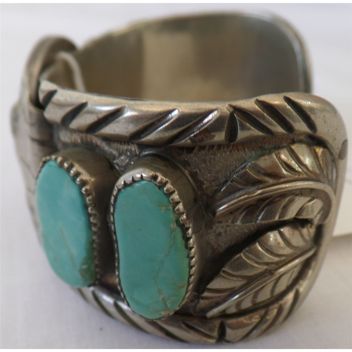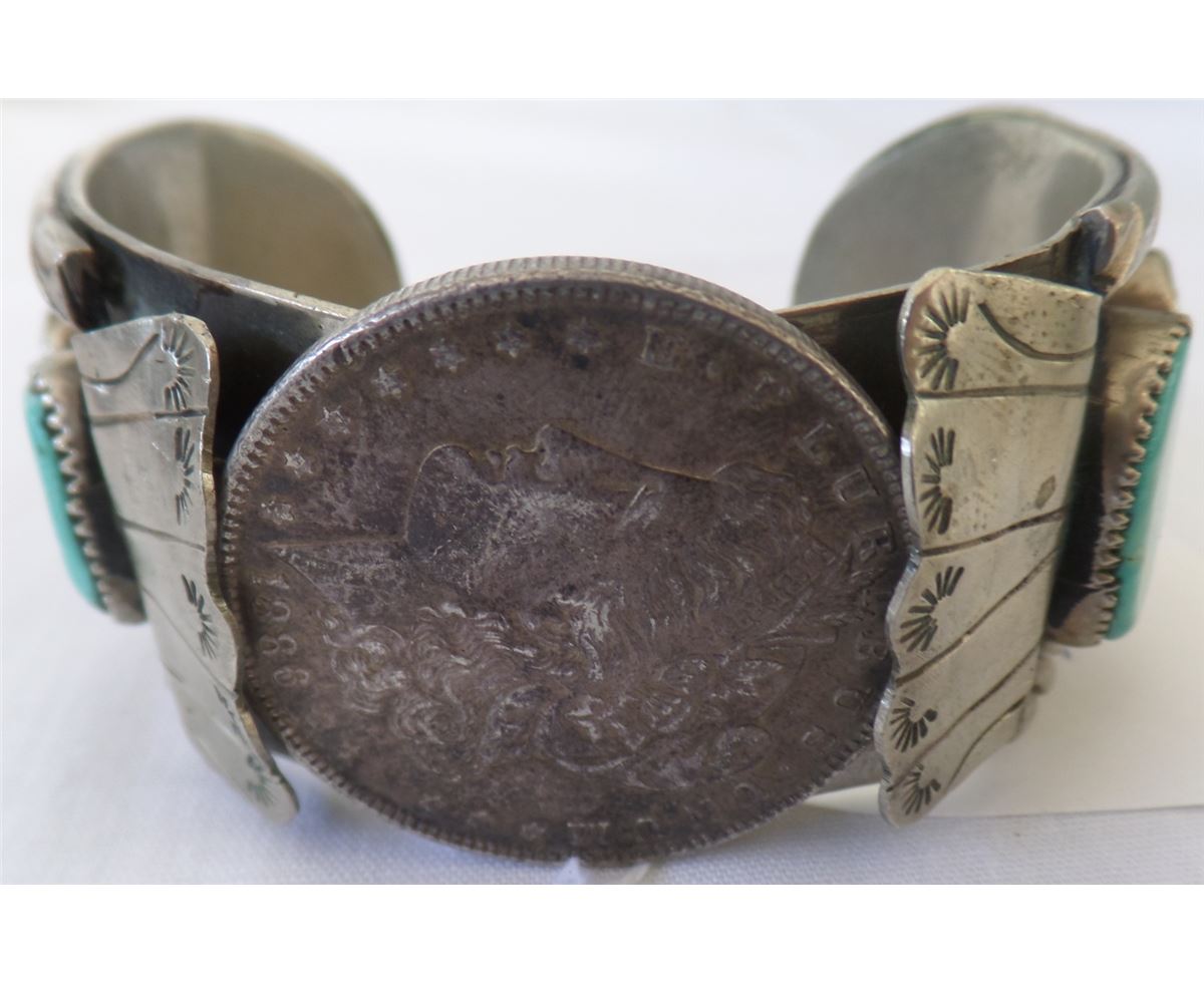 Navajo Watch Bracelet w/Silver Dollar. From the 1950s. Made of sterling silver, turquoise nuggets, and silver dollar. The silver dollar was found as part of a buried treasure in a wooden box in Alpine, CA. This would account for why the coin appears tarnished. Has a 2" opening, and measures 7.5" x 1.2" wide. Weighs approx. 125.5 grams. Navajo. Bracelet has silver leaf design on both ends. Condition: Nice, worn, see images. Shipping: 16.00
