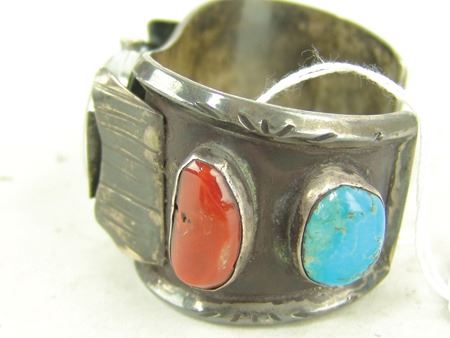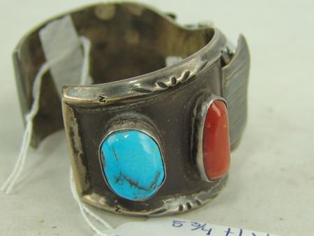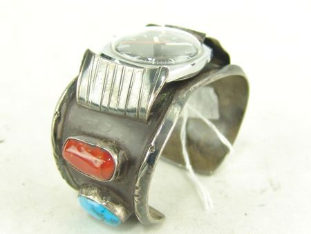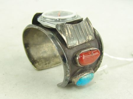 Ca. 1960s-1970s, Vintage wide all-silver cuff bracelet with large turquoise and coral stones on each side, and (replaceable) watch. Very good condition, unsigned. 5-3/4" + 1" x 1-3/4"