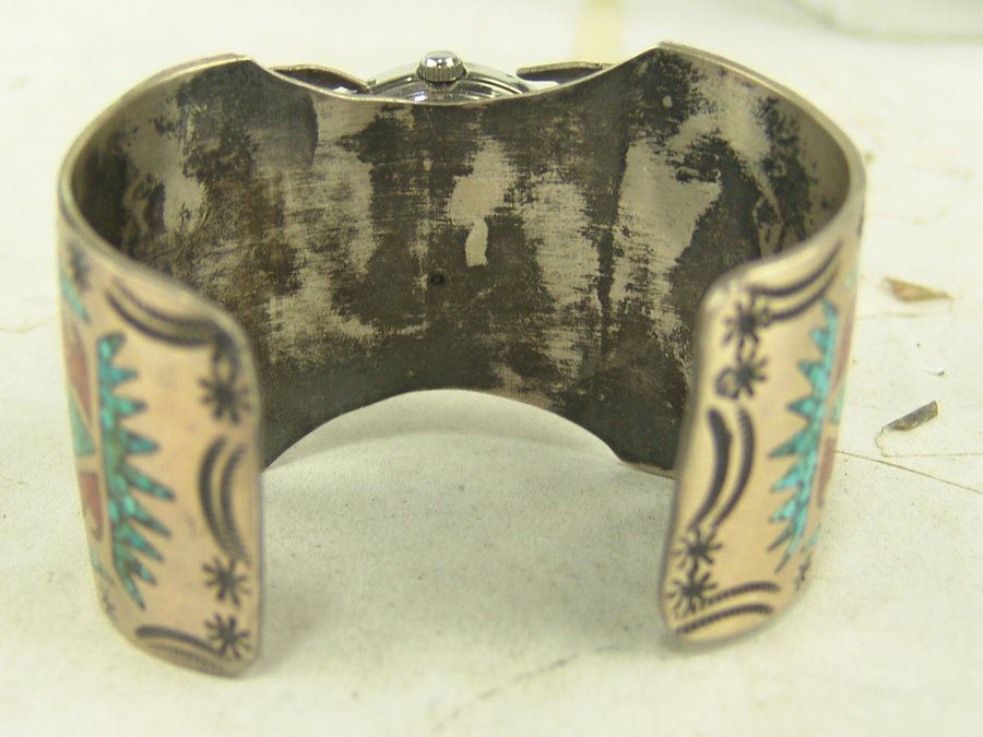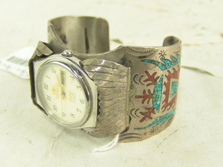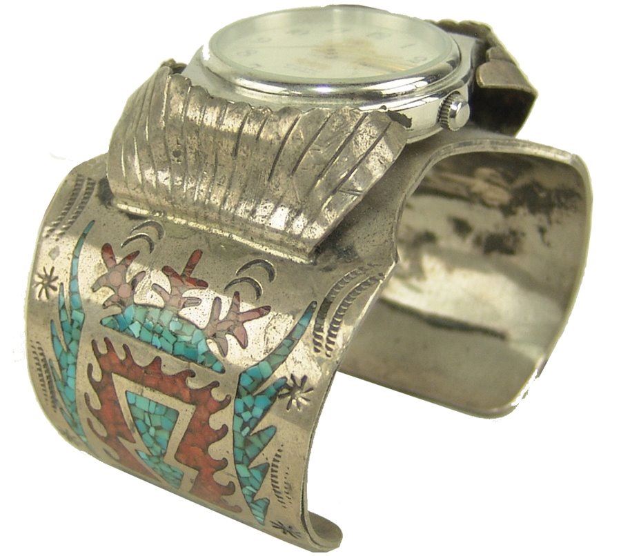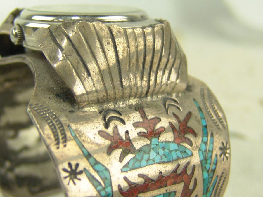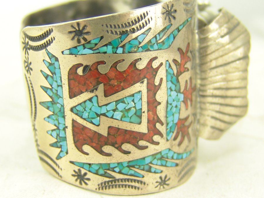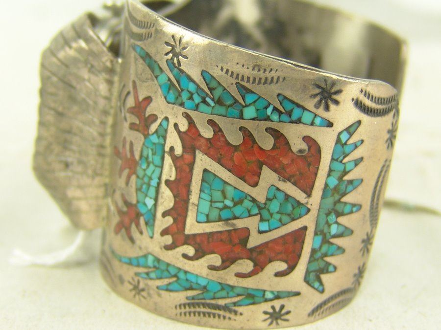 Wide, Singer-style turquoise, coral, and silver chip inlay cuff with stamped details. Very good condition.,Ca. 1970s,Mens