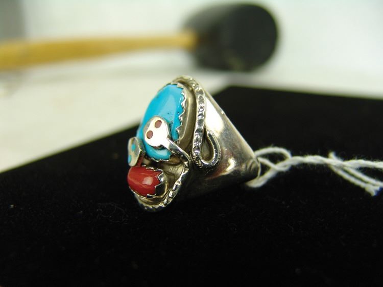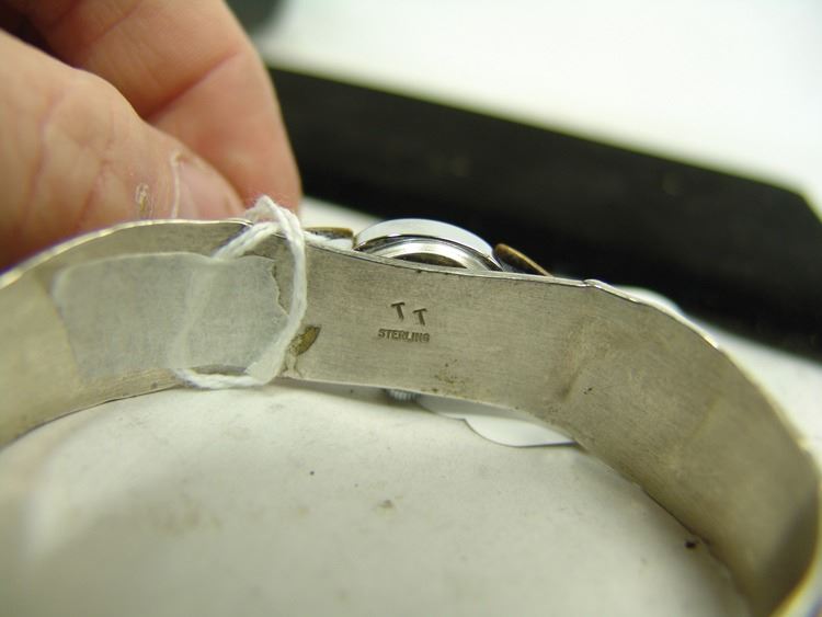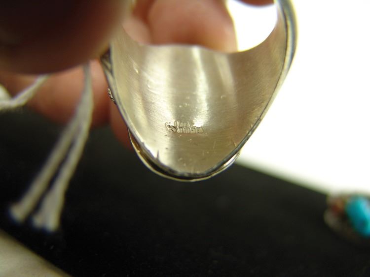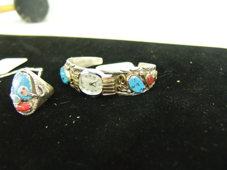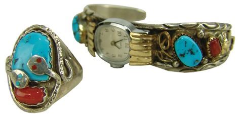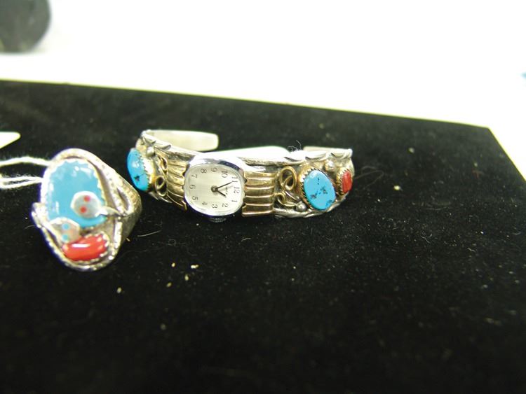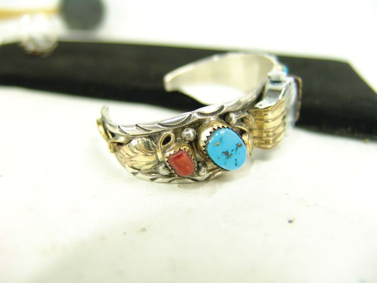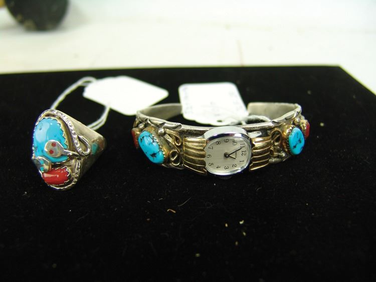 Fine all silver ladies watchband with elaborated leaf and work done with 14kt gold overlay with signed "TT", plus a all silver size 12-1/2 ring by Effie Calavaza (who is actually Zuni) with turquoise and coral,Ca. 1970s-1980s,5-1/2" + 1-1/4" x 5/8", ring 12-1/2