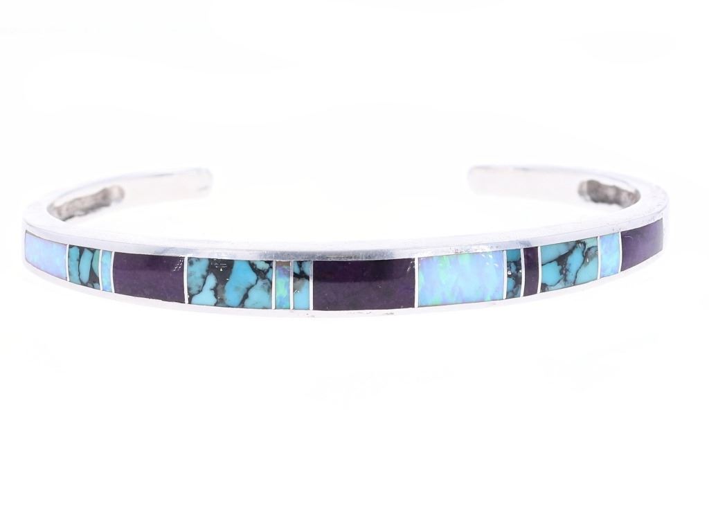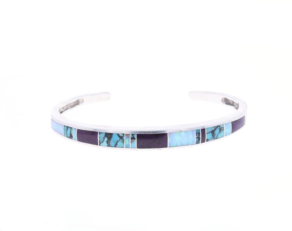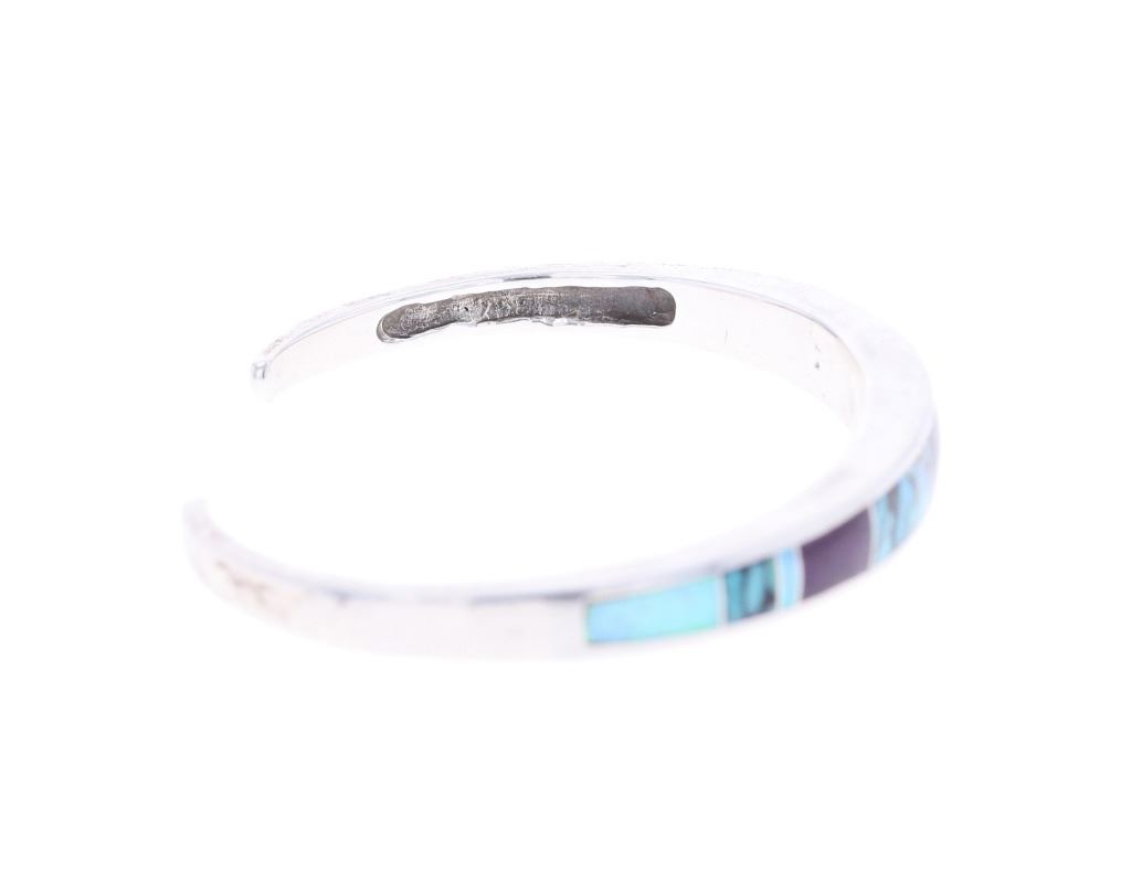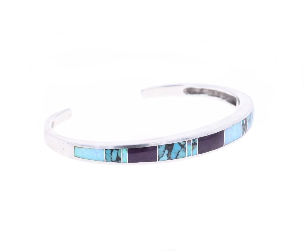 Featured in this lot is this inlaid multistone bracelet from Navajo artist Wayne Etsitty. The bracelet features a wonderfully and professionally crafted sterling silver and multistone construction that includes stones such as: Opal, Labradorite, and number 8 turquoise. The bracelet is marked on the underside as follows: W - Sterling - (arrowhead pictomark). Wayne Etsitty is a contemporary Native American artist known for his work in jewelry design. He is a member of the Navajo (Diné) Nation and is recognized for his craftsmanship and creativity in the field of Native American jewelry. Etsitty's work is celebrated for its blend of traditional Navajo techniques with modern, innovative designs. The condition of this Navajo bracelet is good with no obvious signs of damage and shows good overall condition. The overall measurements of this bracelet is 2" x 2 5/8" x 1/4" and the full circumference with the gap is 6 1/2" and the length of the inside of the bracelet measures 5 1/2". The collective weight of this bracelet is 19.8g.