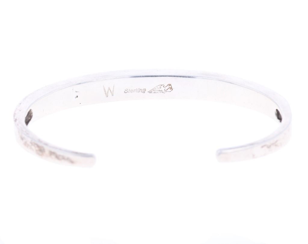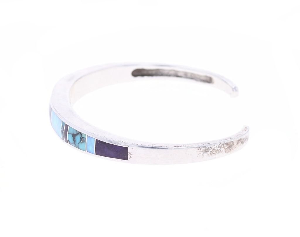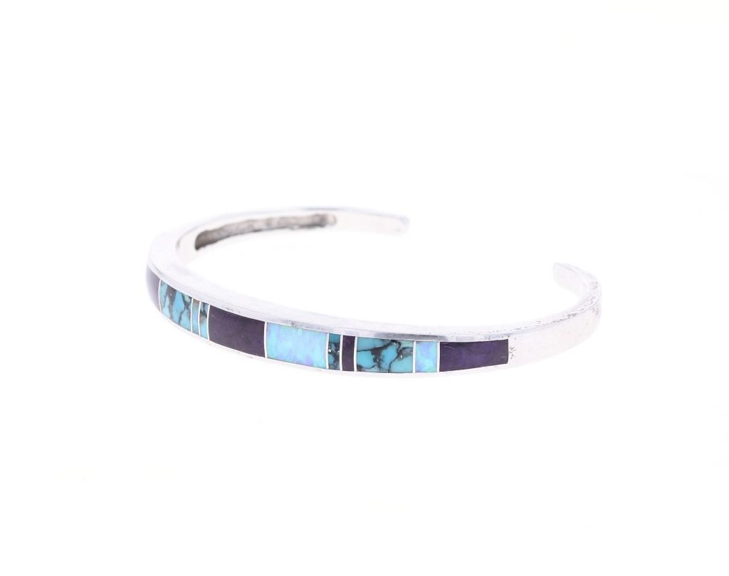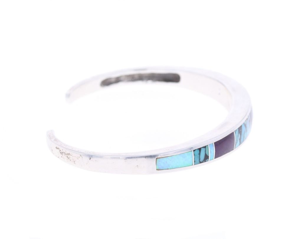 Featured in this lot is this inlaid multistone bracelet from Navajo artist Wayne Etsitty. The bracelet features a wonderfully and professionally crafted sterling silver and multistone construction that includes stones such as: Opal, Labradorite, and number 8 turquoise. The bracelet is marked on the underside as follows: W - Sterling - (arrowhead pictomark). Wayne Etsitty is a contemporary Native American artist known for his work in jewelry design. He is a member of the Navajo (Diné) Nation and is recognized for his craftsmanship and creativity in the field of Native American jewelry. Etsitty's work is celebrated for its blend of traditional Navajo techniques with modern, innovative designs. The condition of this Navajo bracelet is good with no obvious signs of damage and shows good overall condition. The overall measurements of this bracelet is 2" x 2 5/8" x 1/4" and the full circumference with the gap is 6 1/2" and the length of the inside of the bracelet measures 5 1/2". The collective weight of this bracelet is 19.8g.