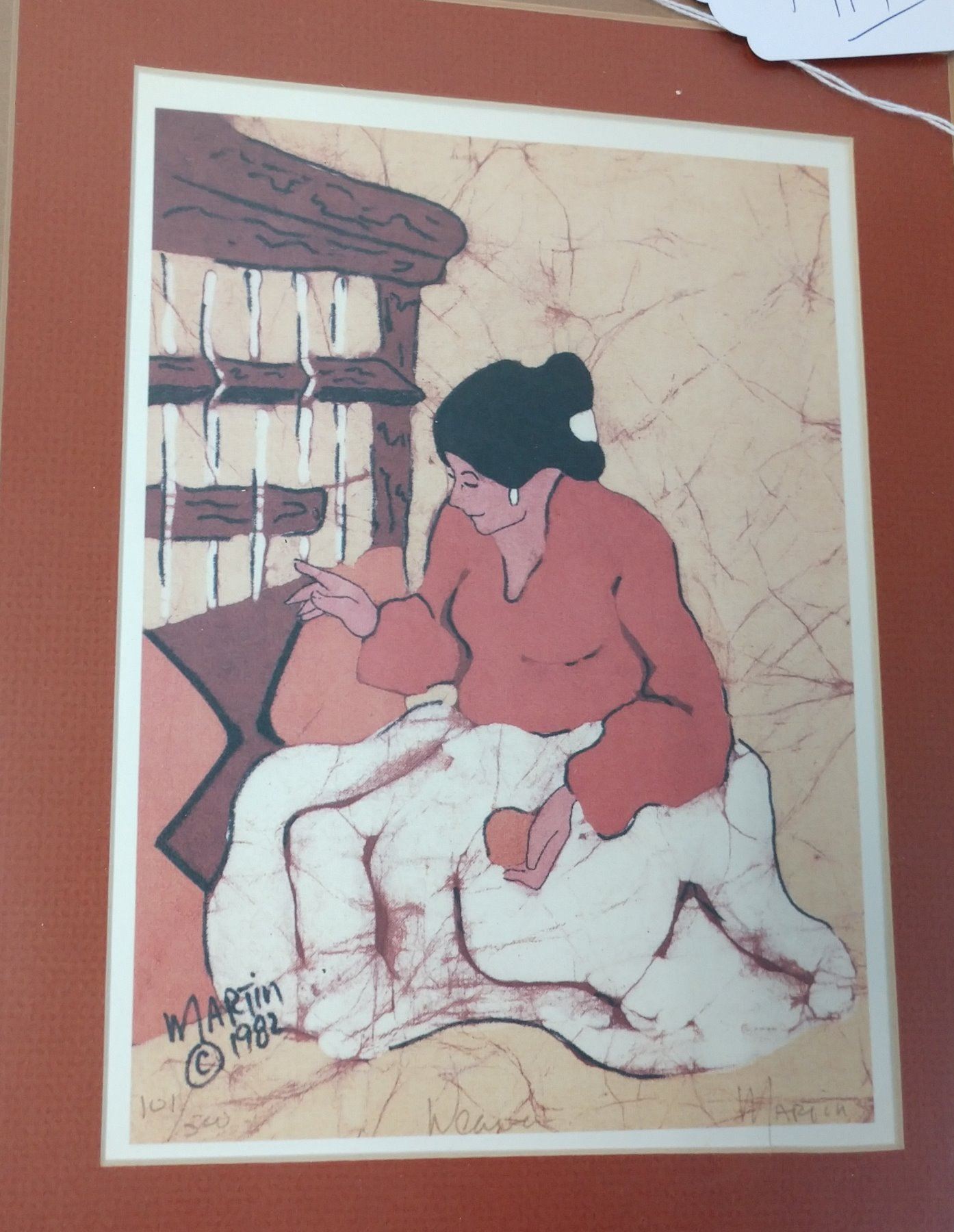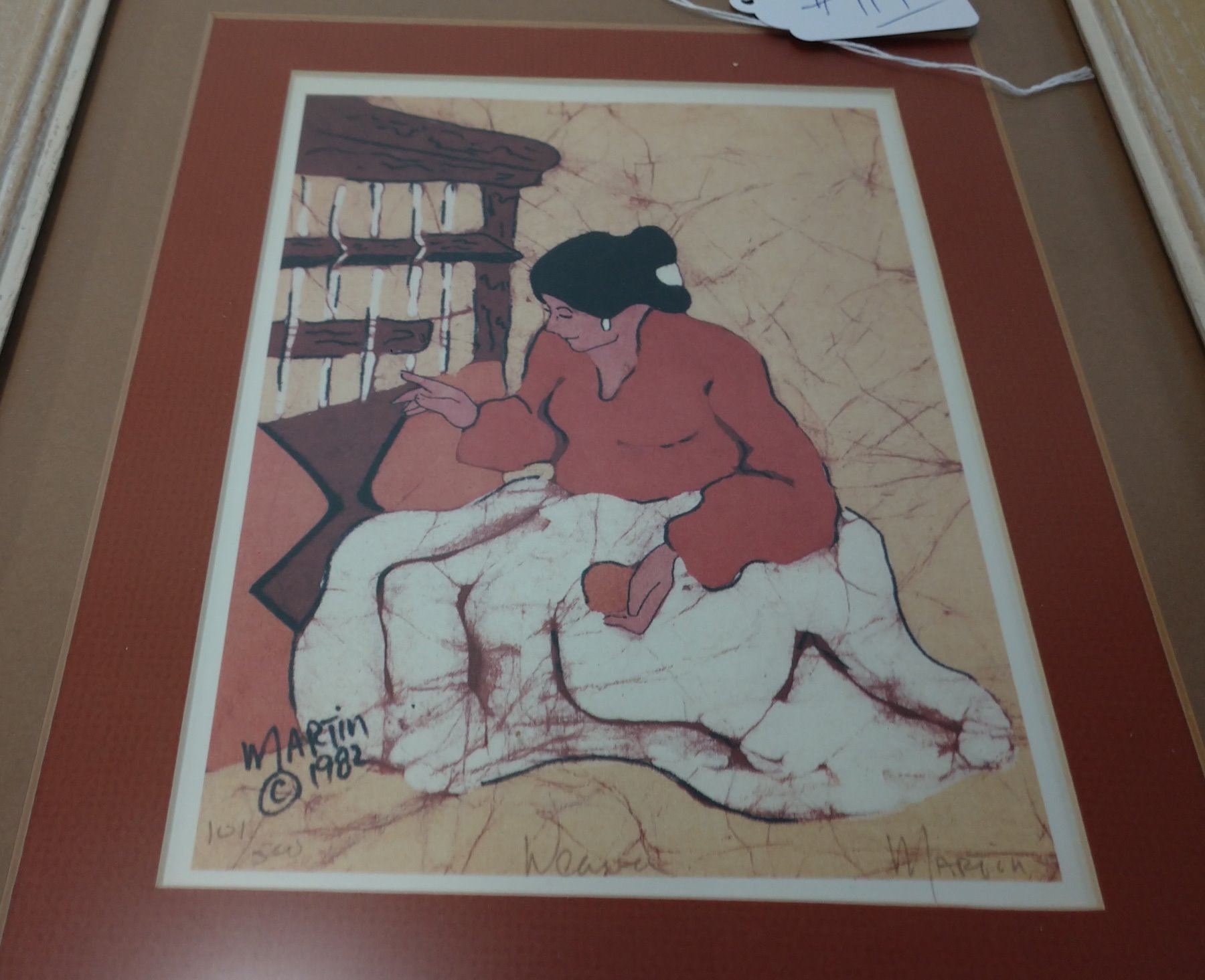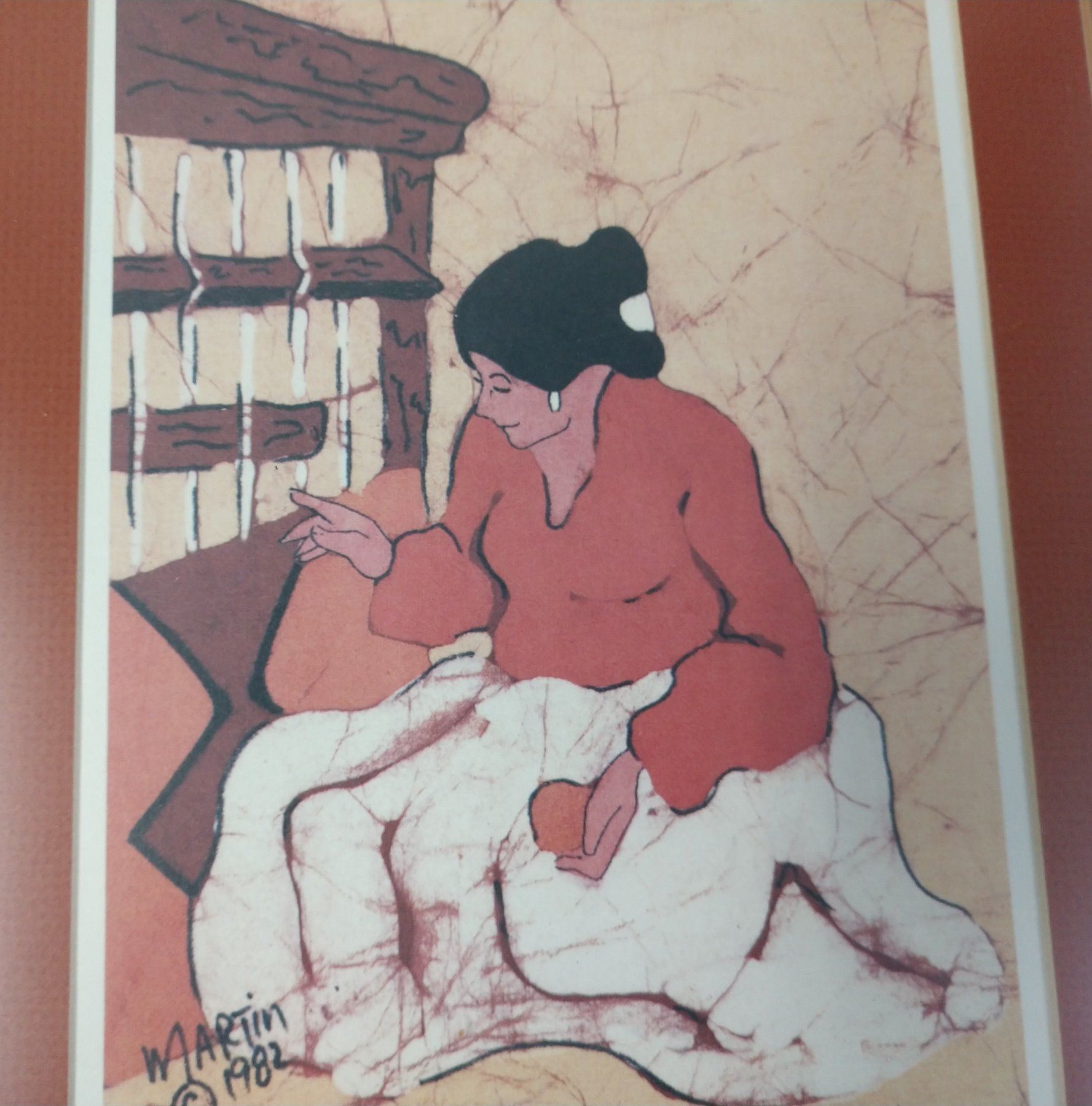 Navajo "Weaver" Print by Martin, 20th century item. Made of glass, wood and paper, the item measures 20 1/2" x 16 1/2" x 3". USA. Signed, 1982. Navajo weaver depicted. Condition: Good, see images. Shipping: $32.00 w/insurance and signature, wrapped.