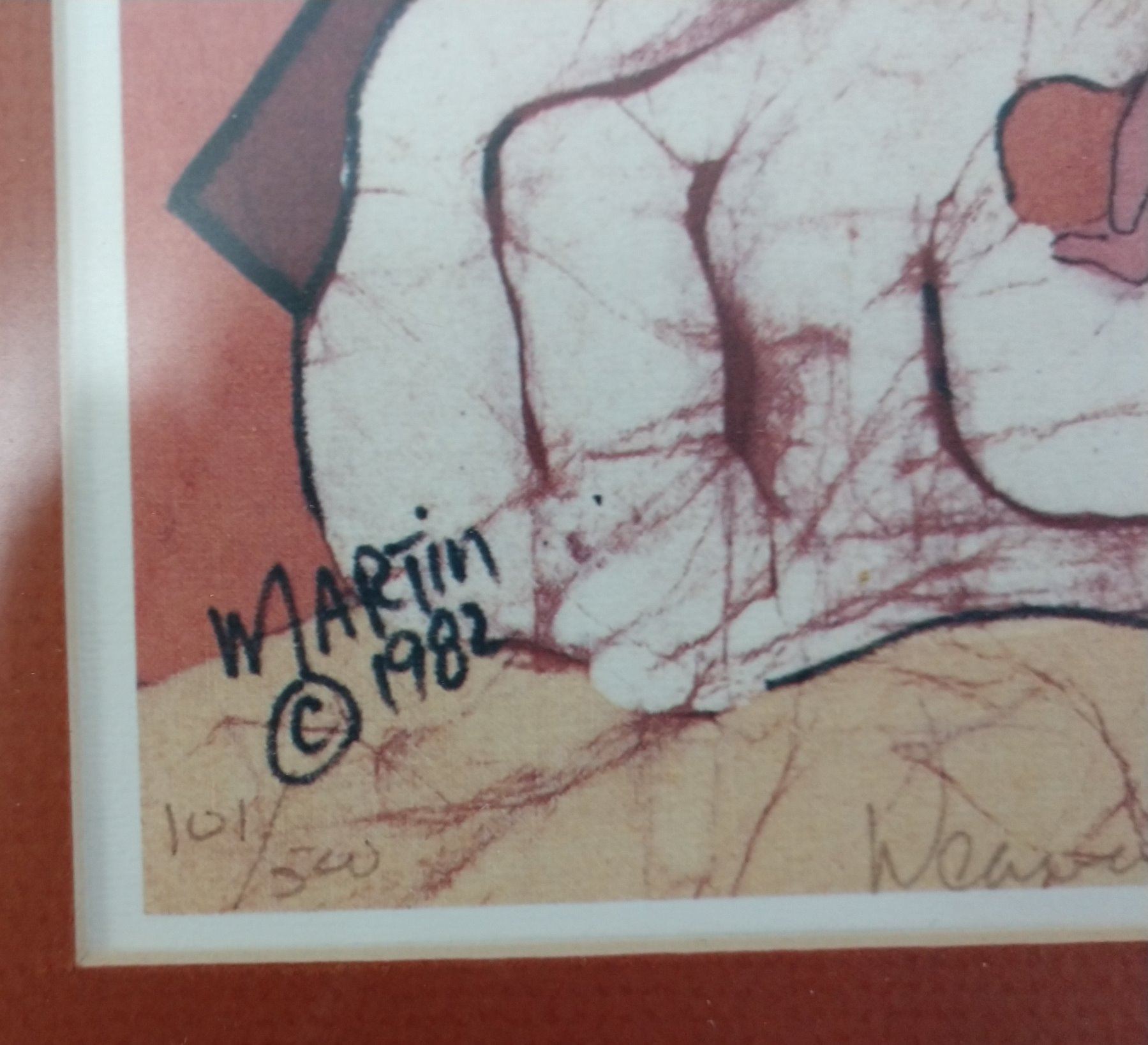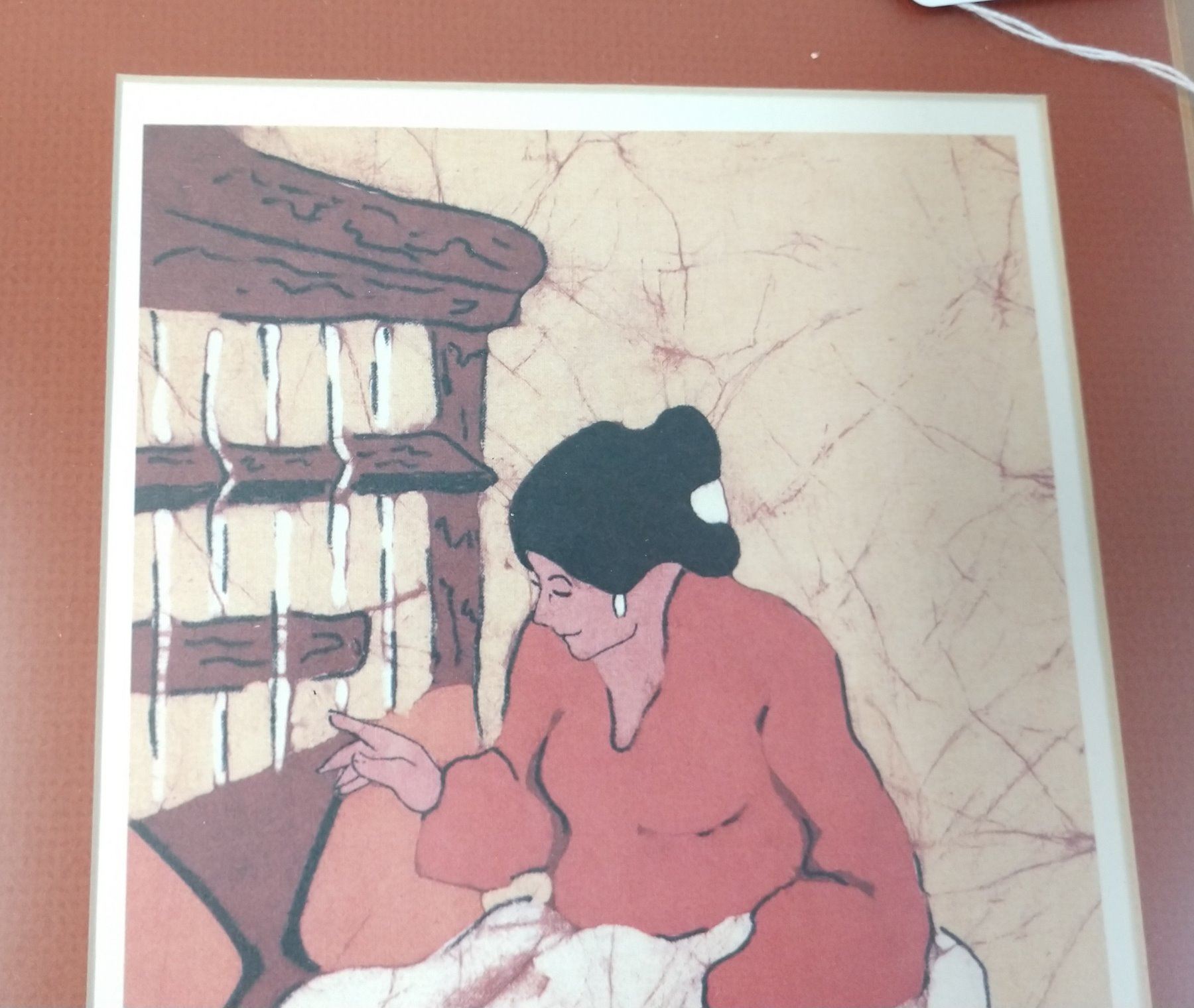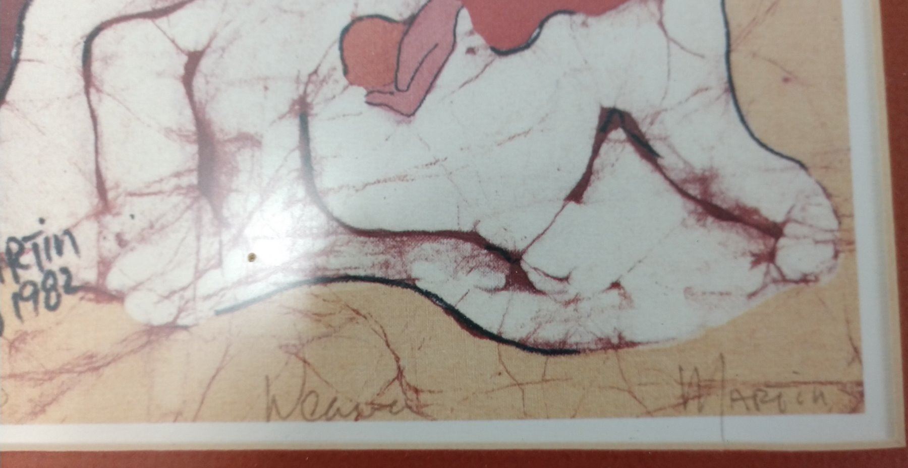 Navajo "Weaver" Print by Martin, 20th century item. Made of glass, wood and paper, the item measures 20 1/2" x 16 1/2" x 3". USA. Signed, 1982. Navajo weaver depicted. Condition: Good, see images. Shipping: $32.00 w/insurance and signature, wrapped.