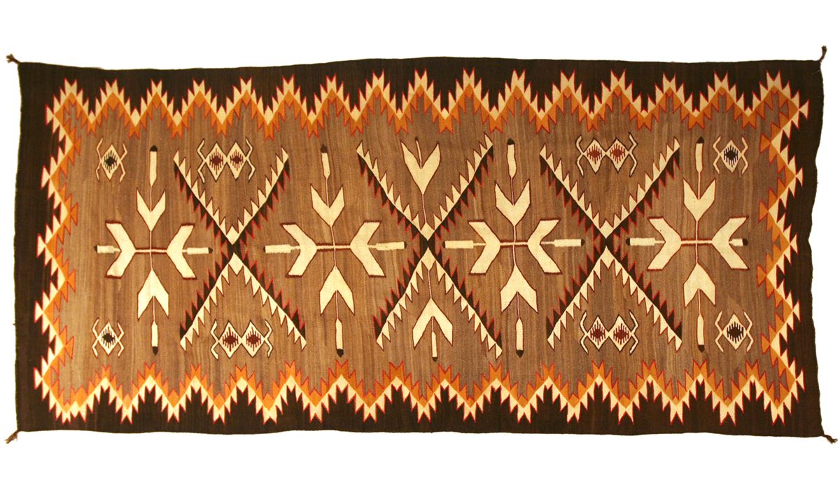 Navajo Weaving. 10'6" x 4'9". Red mesa area. Feather and water bug designs set amongst serrated crosses and inside a serrated border. Circa 1920-1930.