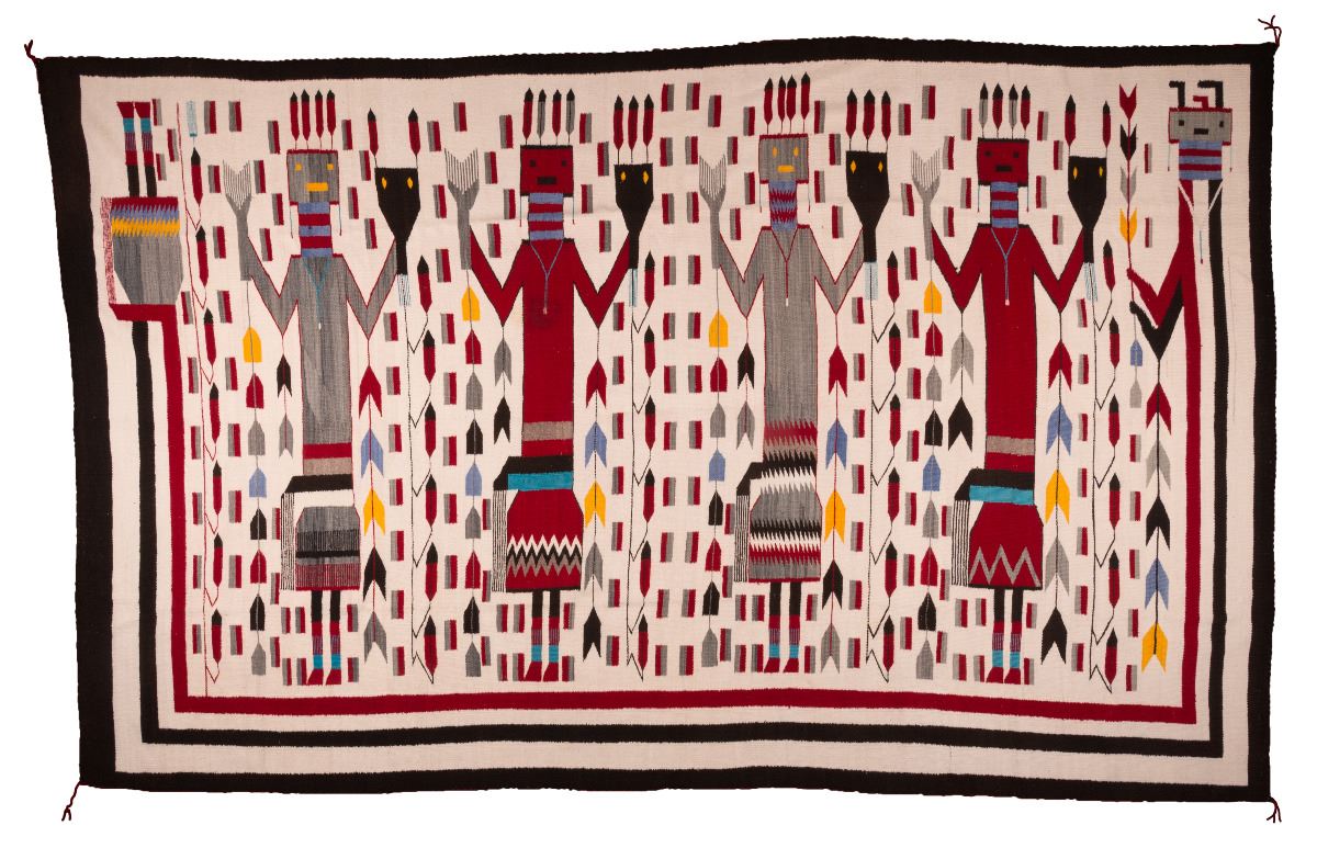 Navajo Weaving. 12' x 7'5" Room sized Yei. Very difficult to find Yei room-sized weavings. Four figures holding masks and feathers surrounded by a Rainbow Guardian. Circa 1950.