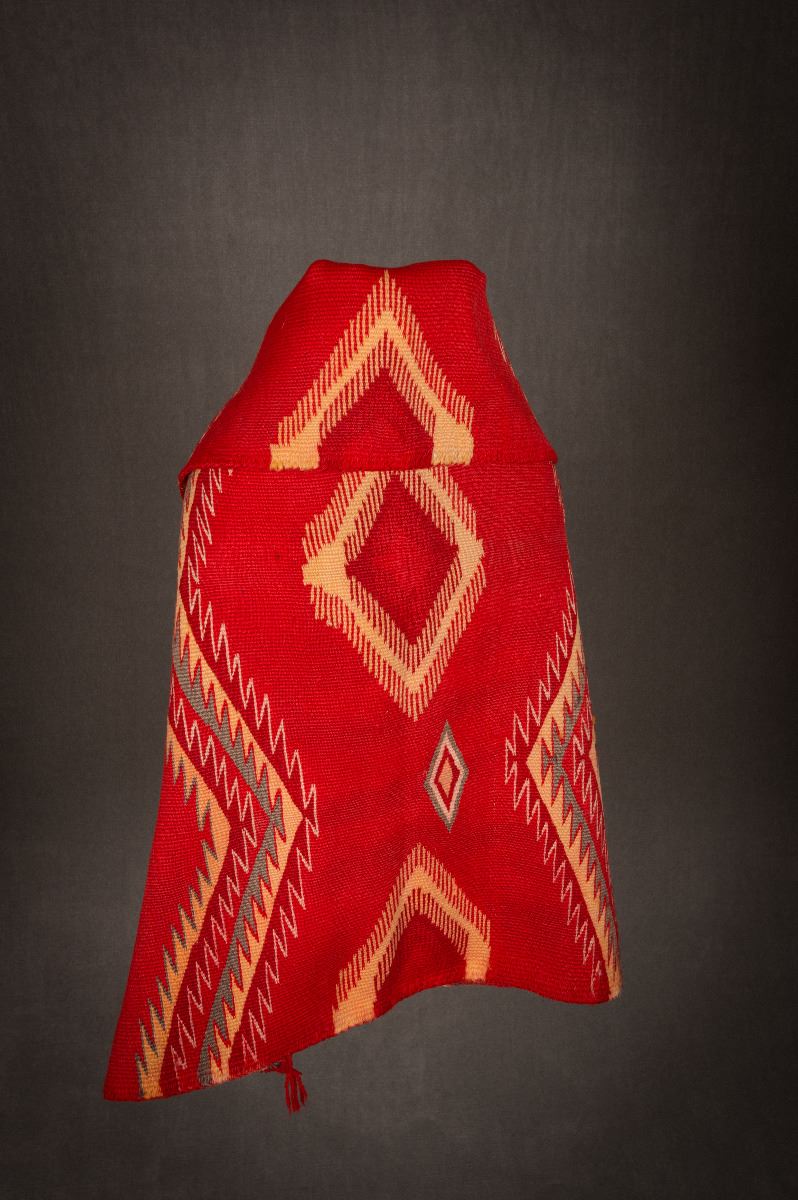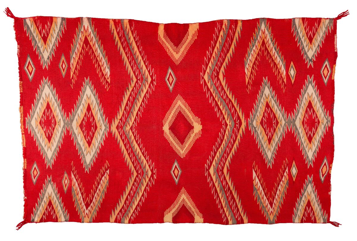 Navajo Weaving. 2'6" x 3'8" child's wearing blanket with fancy, eye-dazzler designs. Woven from Germantown yarn. Circa 1900.