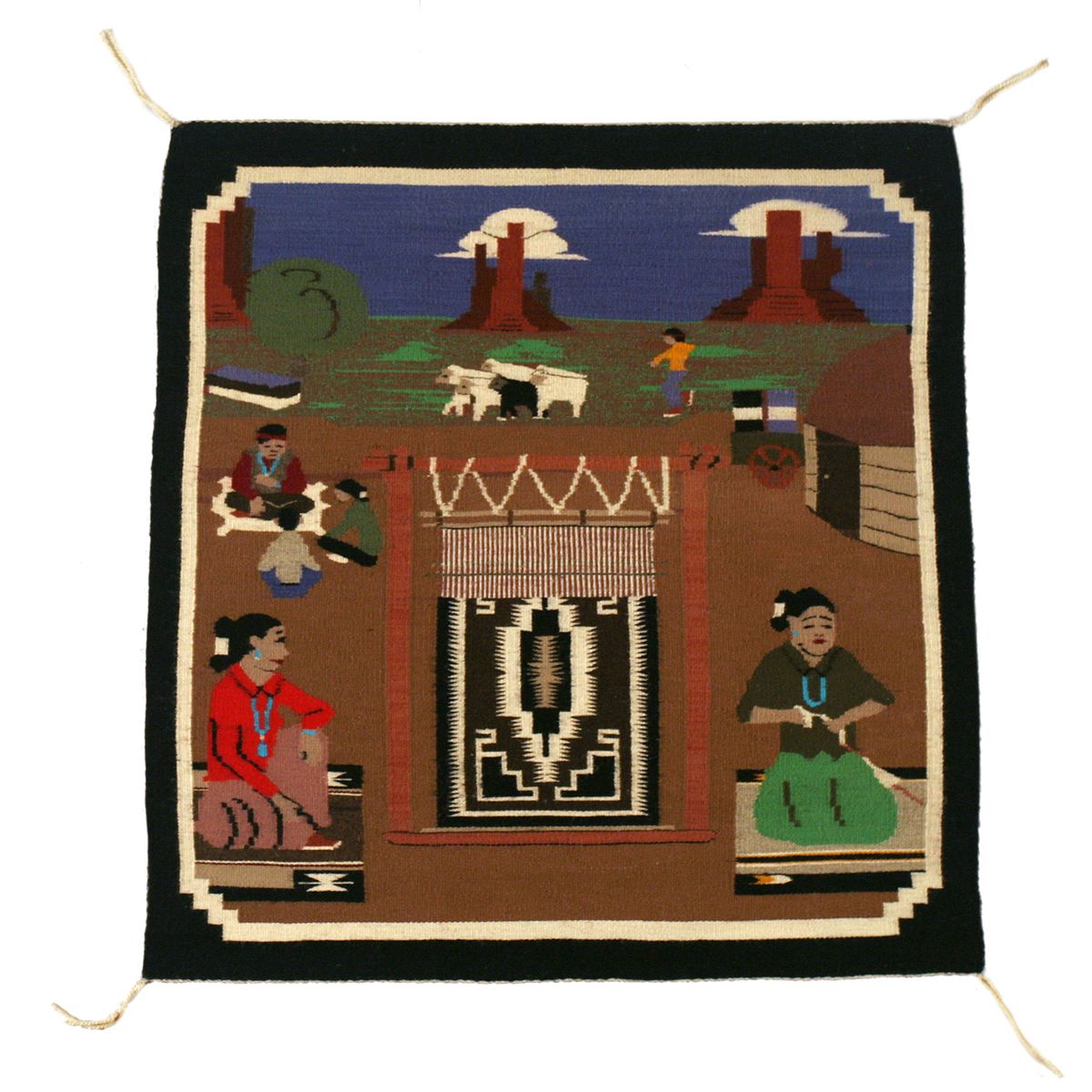 Navajo Weaving. 2'9" x 2'7". Fine pictorial pattern, woven by Sarah Tso. In 1994 Sarah had an exhibition, “The Image-makers”, at the Wheelwright Museum of the American Indian in Santa Fe, NM. Her works are found in many important collections, including the Mr. and Mrs. Leonard Bernstein Collection. 20th century.