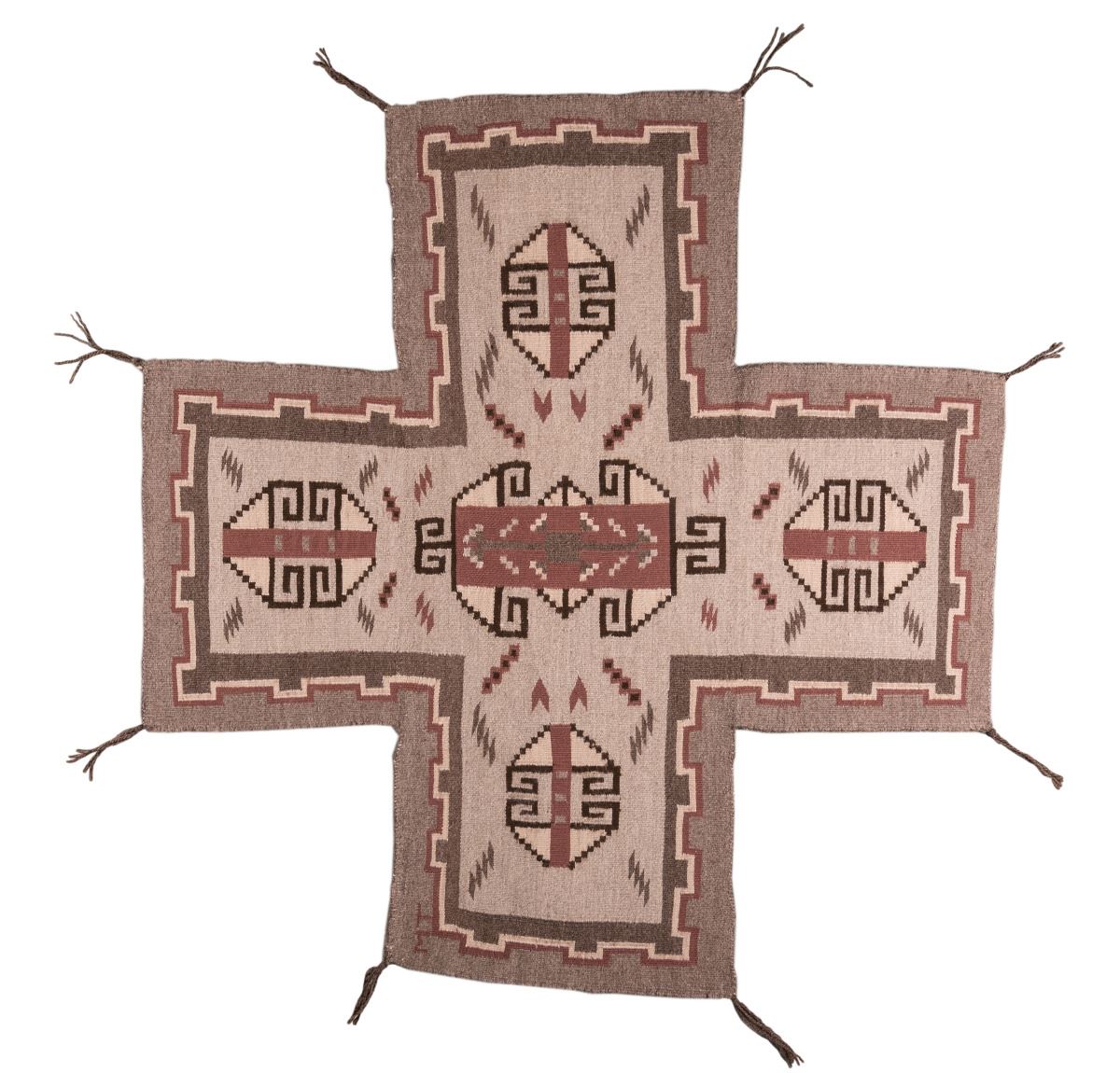Navajo Weaving. 3'6" x 3'4". Hubbell Trading Post weaving by Maggie Tom. Unusual cross design. Circa 1990s.