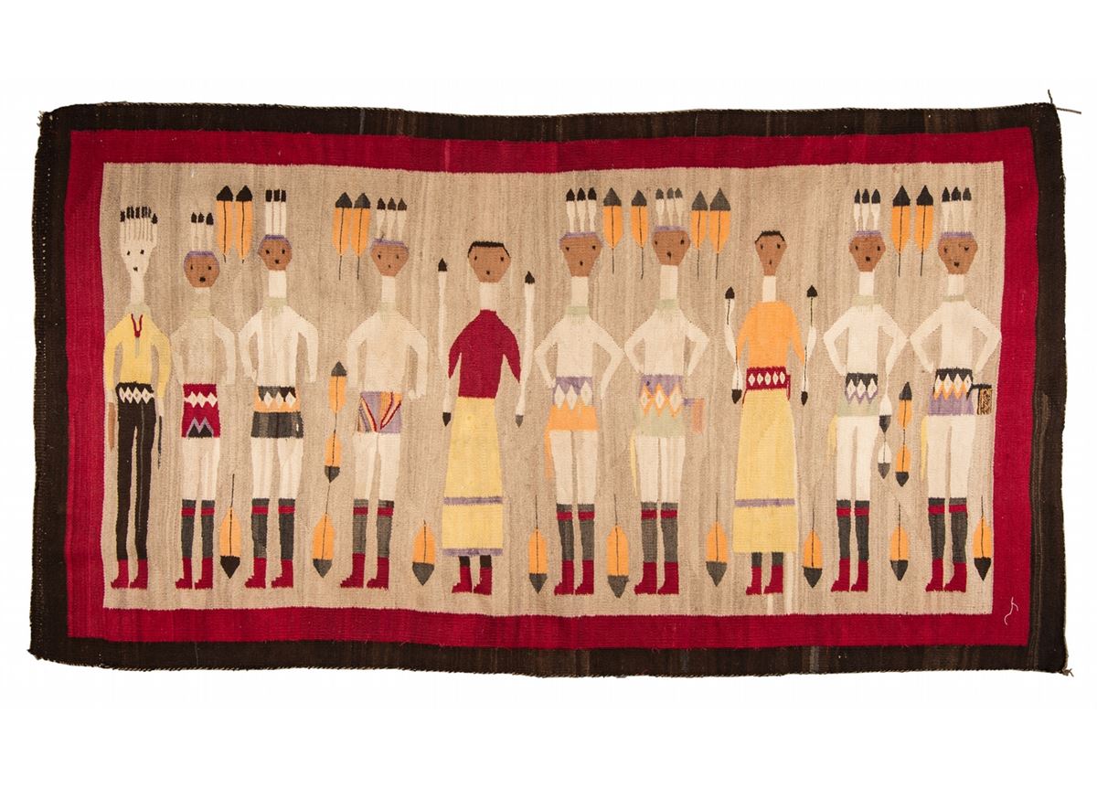 Navajo Weaving. 6'9" x 3'7". A weaving depicting 10 Yei figures. Natural and vegetal dyes. Circa 1930.