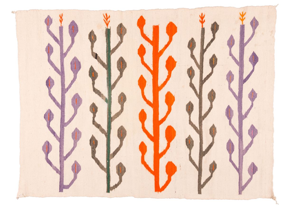 Navajo Weaving. 3'9" x 2'10". A one-of-a-kind, sacred beanstalk weaving. Seldom are beanstalks woven as the only image in Navajo textile. Here, you have five beanstalks in a row. Very rare. Woven from Churro and Churro cross wool on a wool warp. Circa 1930s.