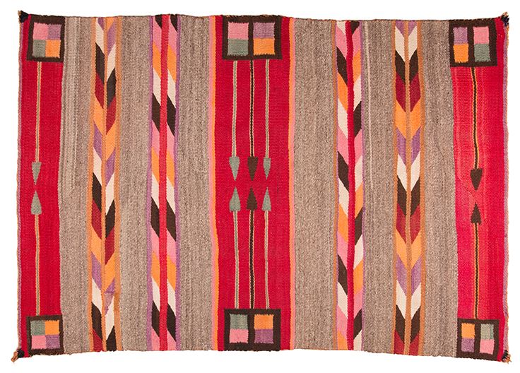 Navajo Weaving. 4'1" x 2'9". An antique pictorial, double saddle blanket with five pairs of opposing arrows and colorful chevron panels. The corner and mid-field motifs are colorful box elements. Woven from smooth, long staple Churro sheep wool on a wool warp. Most likely woven in the Red Mesa Area. Circa 1900.