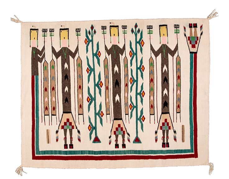 Navajo Weaving. 4'1" x 3'2". Yei pictorial weaving. Three intricate figures surrounded by a Rainbow Guardian. Circa 1950.