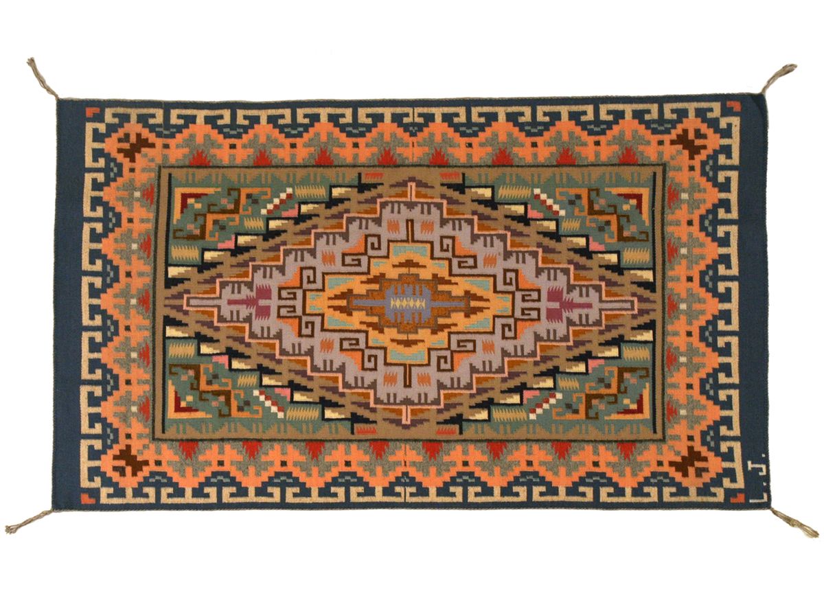Navajo Weaving. 4'10" x 2'11". Burntwater area. Forty-two different colors. Tightly woven by Lillian Joe, who was featured in Schiffer book, 1991. 20th century.
