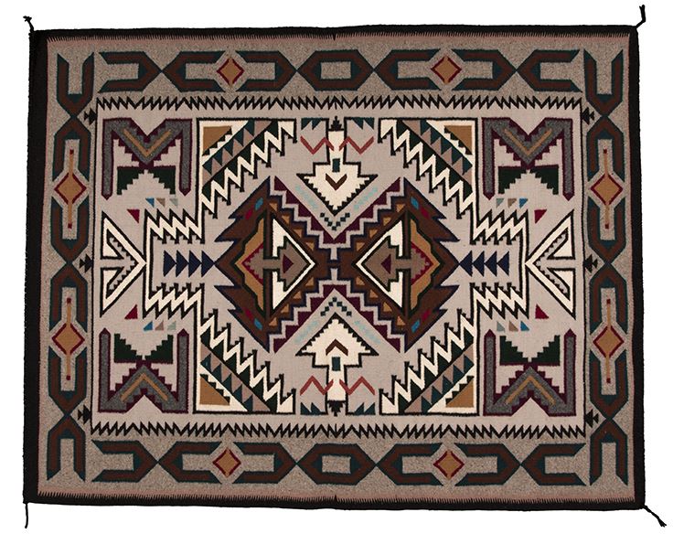 Navajo Weaving. 4'4" x 3'5". Teec Nos Pos Area. Woven by Lula Parrish. Highly intricate, classic designs with sawtooth border. Fine weave. Circa 1950's.