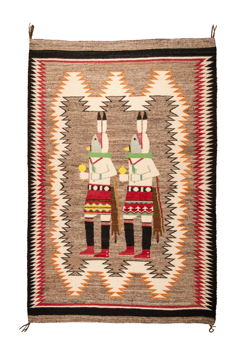 Navajo Weaving. 4'7" x 3'2". A beautifully woven, two-dancer Yei -bi-chai weaving. Probably woven in the Gallegos Canyon area. A meandering border is exquisitely executed in a fine, serrated motif. Woven from very high-quality, smooth, old, long-staple Churro sheep wool and worsted, old Germantown commercial 4-ply yarns. Circa 1920s.