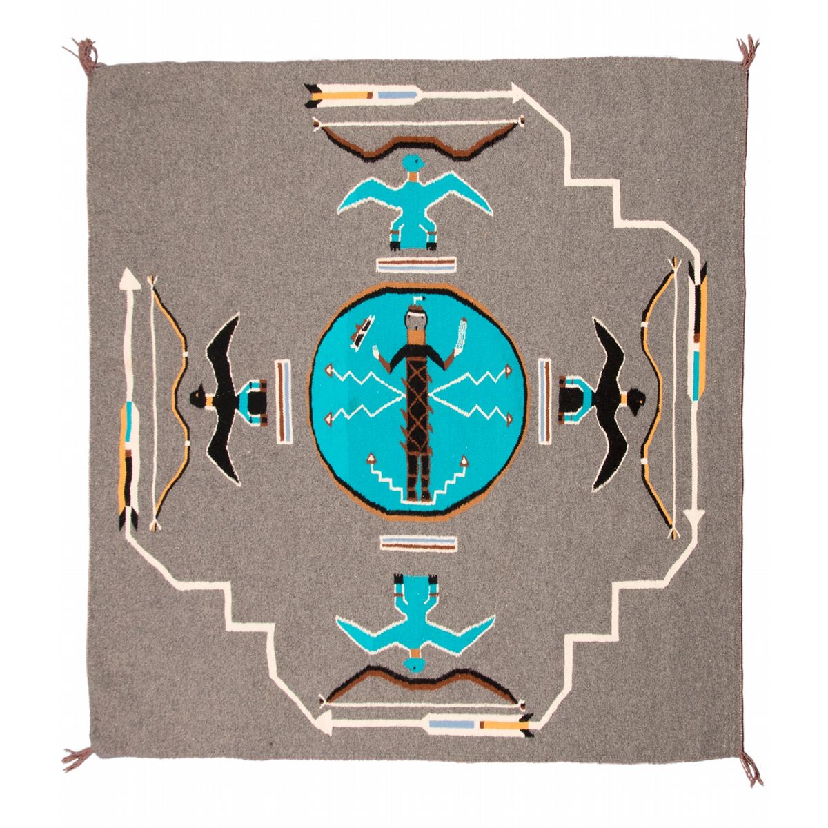 Navajo Weaving. 4'7" x 4'4" beautifully woven sand painting textile depicting Slayer of Alien Gods. The slayer stands in the center of a turquoise circle is surrounded by bows, arrows and eagles. Fairly uncommon. Circa 1970s. After a natural catastrophe, the Navajo Medicine invoked the spirit of the Slayer of Alien Gods to aid the people and put an end to the calamity. In this weaving, the slayer is covered with an armor of flint, lightning and thunder. Since he can control all of these elements, he can also produce calamities at his will. The club above his right hand produces earthquakes. The five lightning arrows in his left hand are used to perplex the clever minds of human beings, especially those who haven't yet gained control of their senses through prayer and meditation. The four lofty eagles each stand on a section of the Rainbow Guardian and assist the slayer. The bows, arrows and lightning guard and guarantee the beneficial purpose of these mystic and sacred symbols so that the alien power may not use them.
