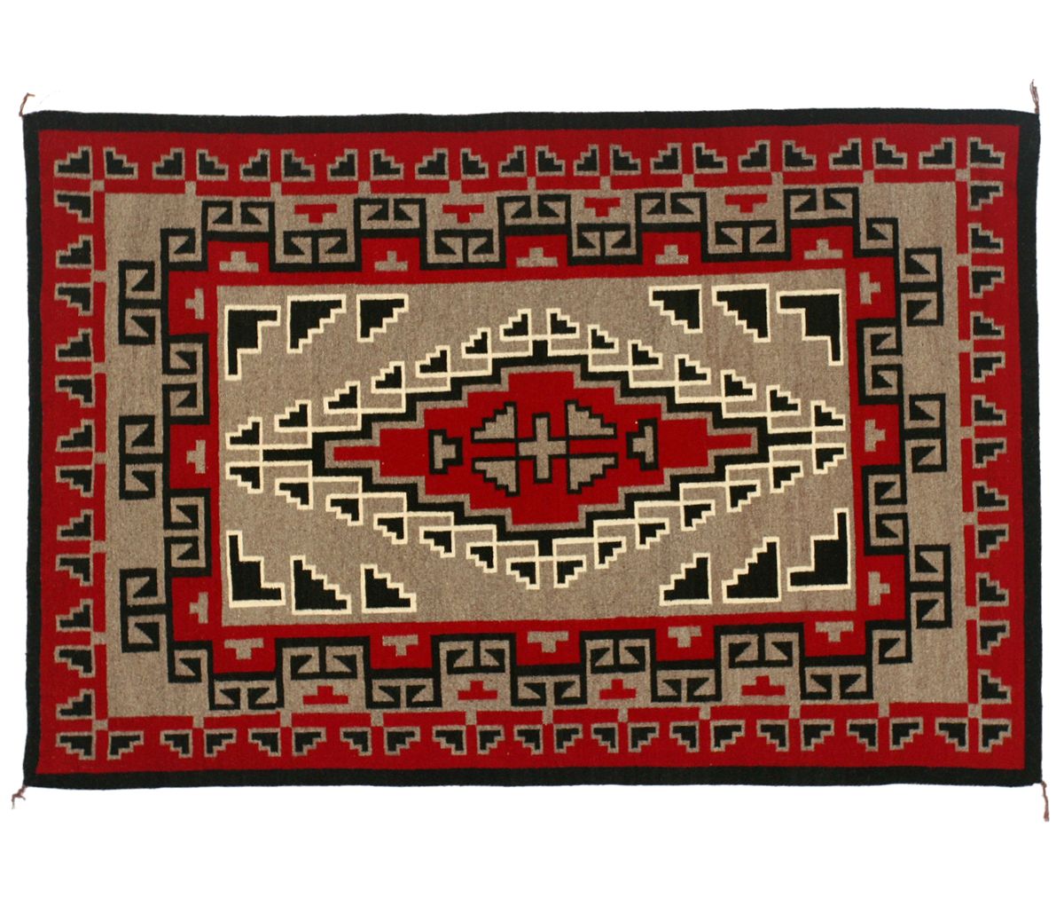 Navajo Weaving. 4'8' x 3'1". Ganado area tapestry weave. Homespun wools with red aniline dyes. All other colors are natural (except black). Woven by Alice Begay. Last quarter 20th century.