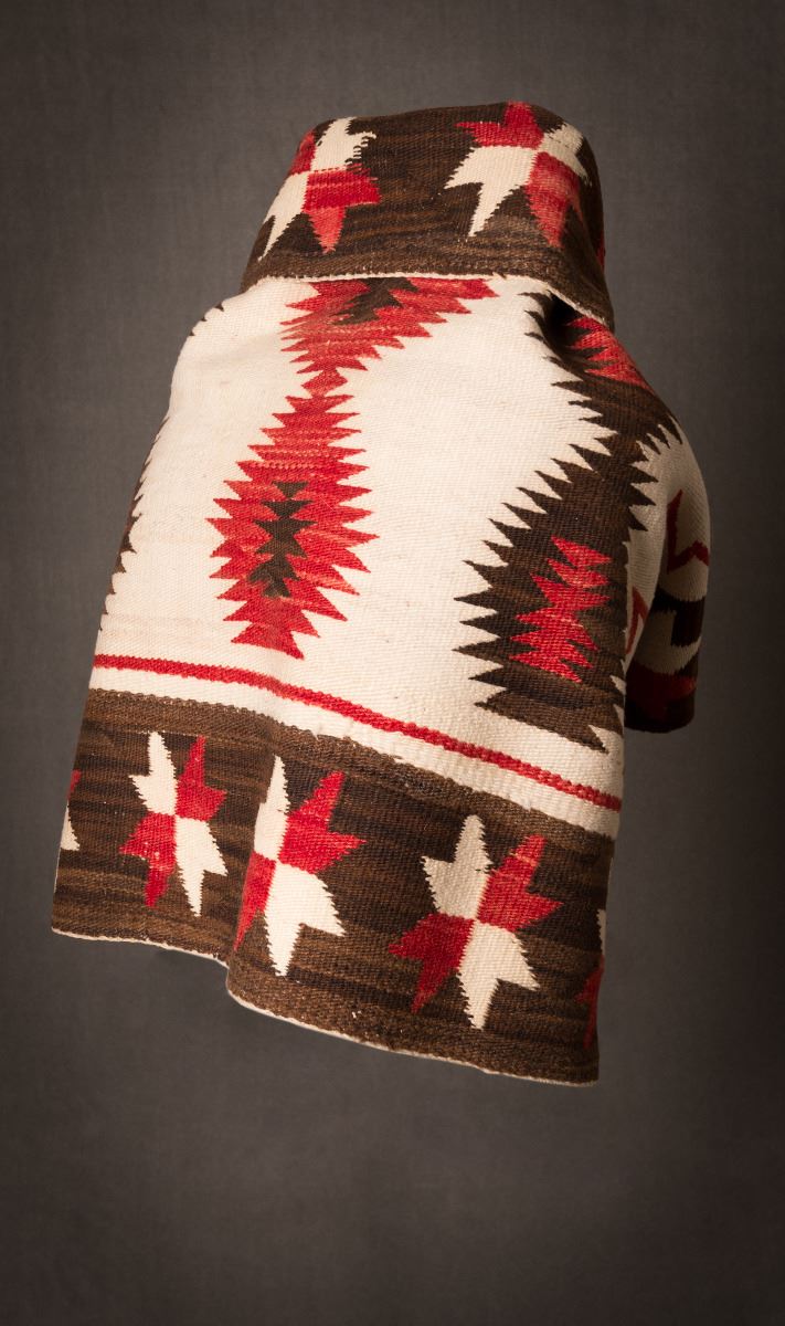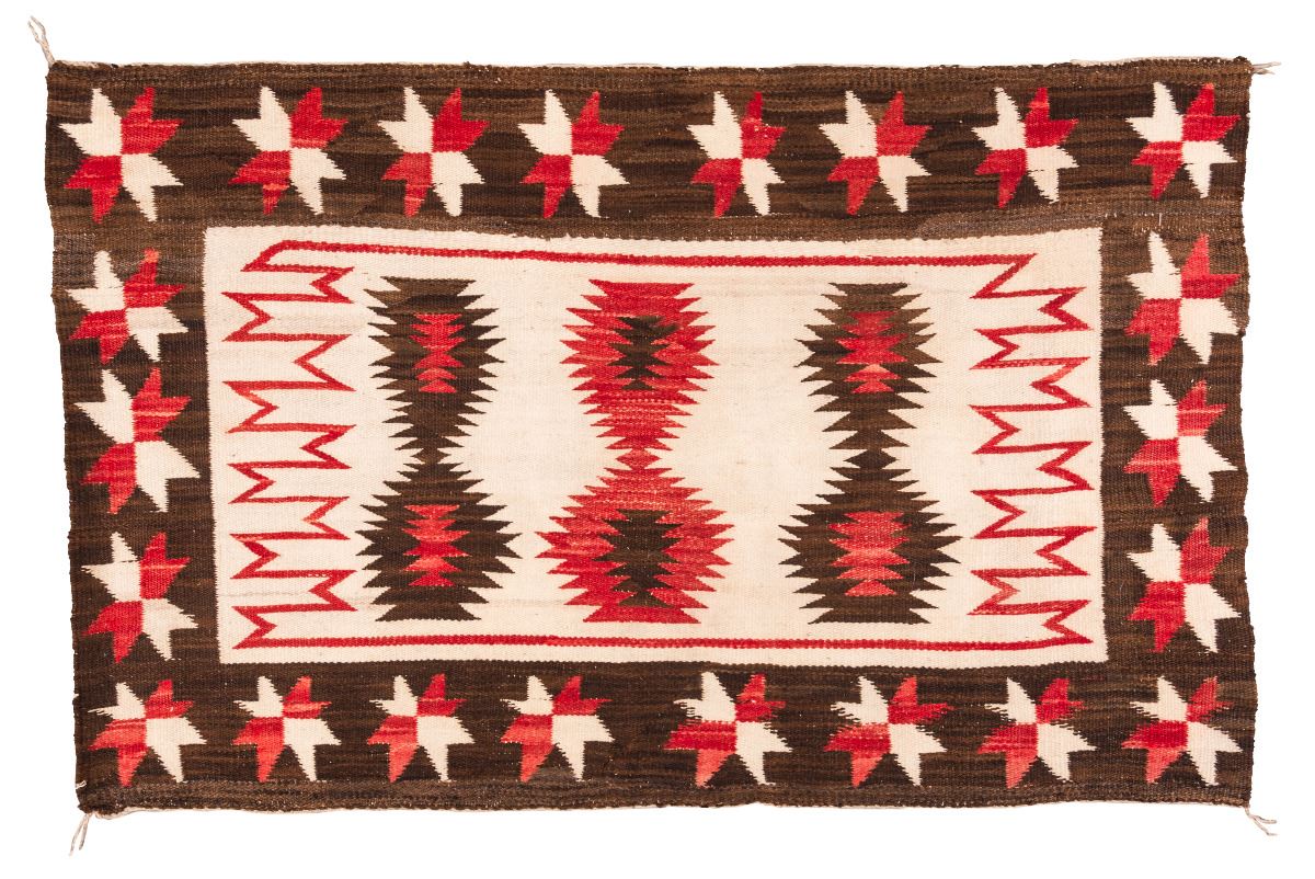Navajo Weaving. 4' x 2'5". A very nice Manta style blanket with central, serrated diamonds and a surrounding Valero star border. Woven wider than long, from all Native, handspun, long-staple Churro sheep wool on a wool warp. Circa 1910.