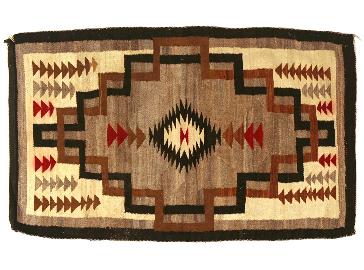 Navajo Weaving. 5'1" x 3'. Interlocking central diamond design with stepped central diamond. Black, white, brown and grey with bold red highlights. Circa 1920s.