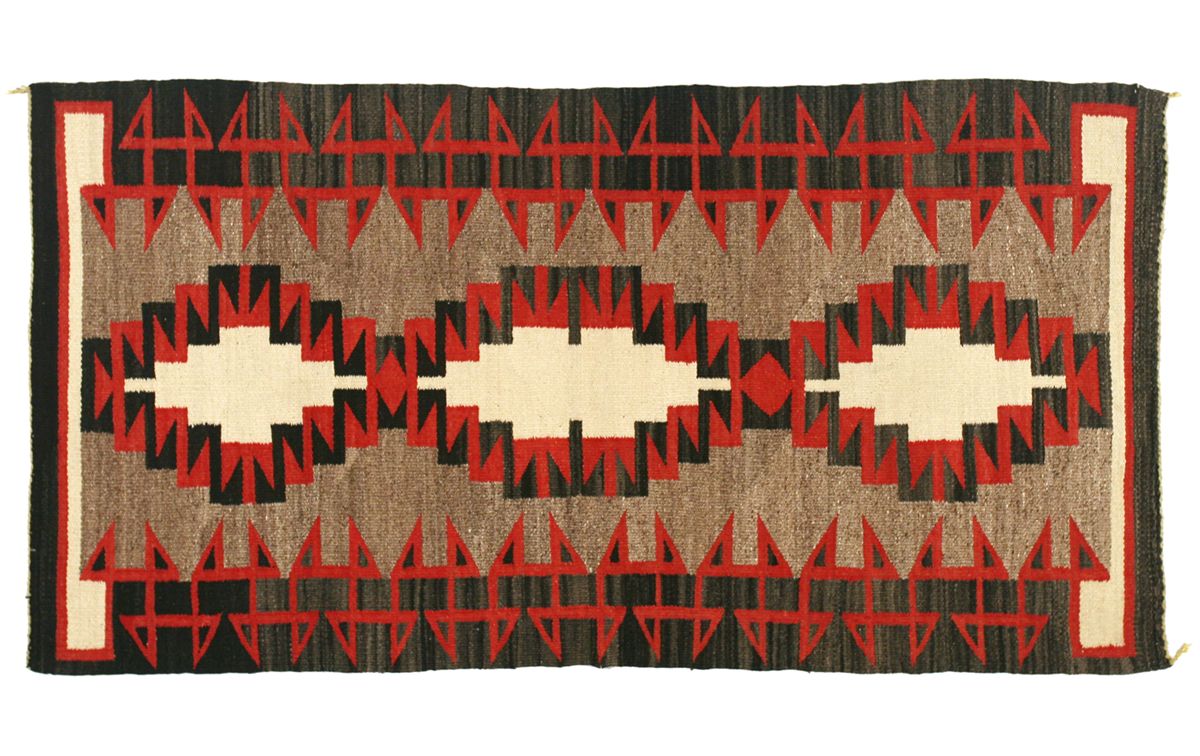 Navajo Weaving. 5'10" x 3". Displaying evolved weaving mastery in a highly elaborate design in colors of red, black, white and grey. Circa 1930s-1940s.