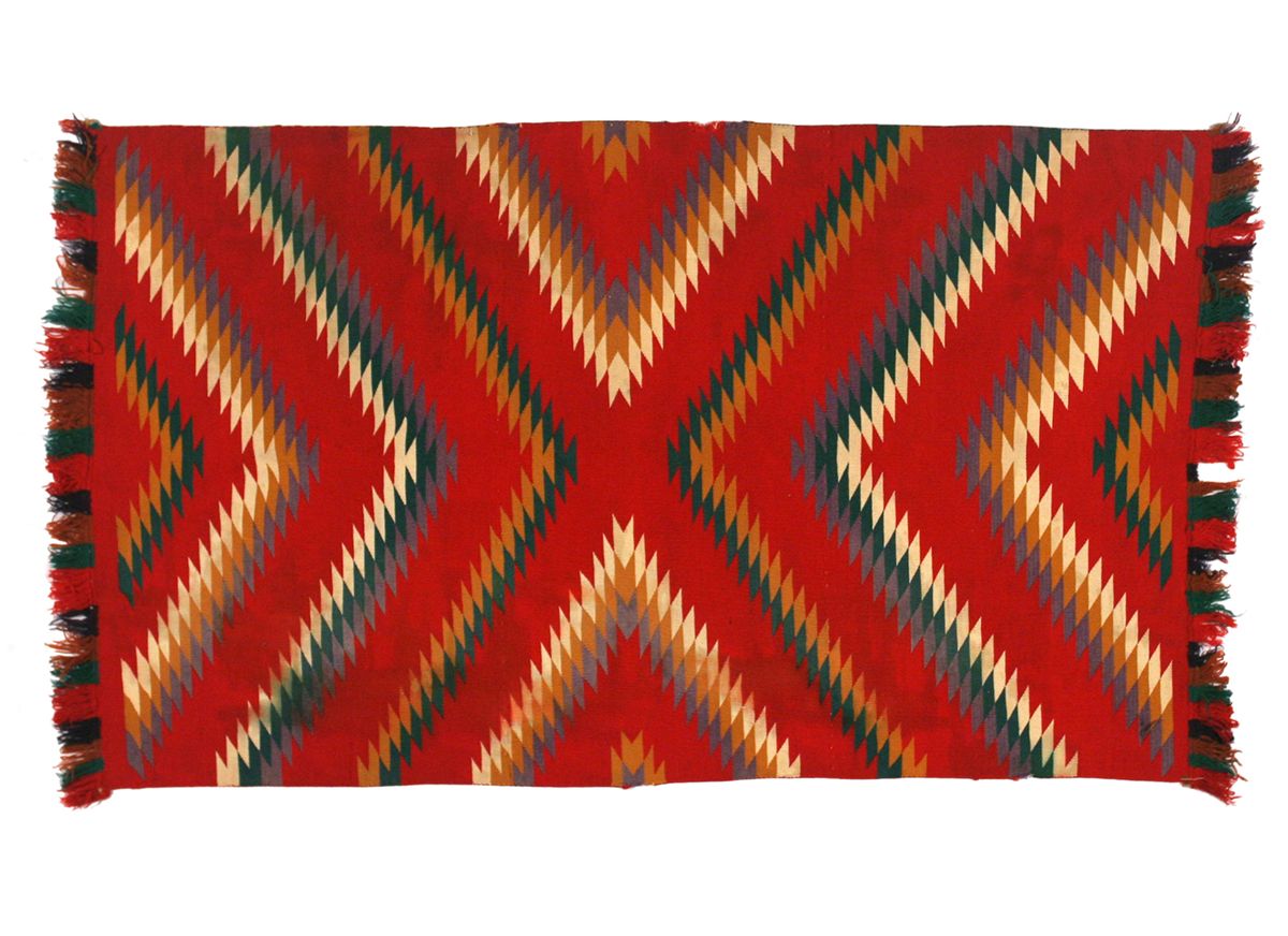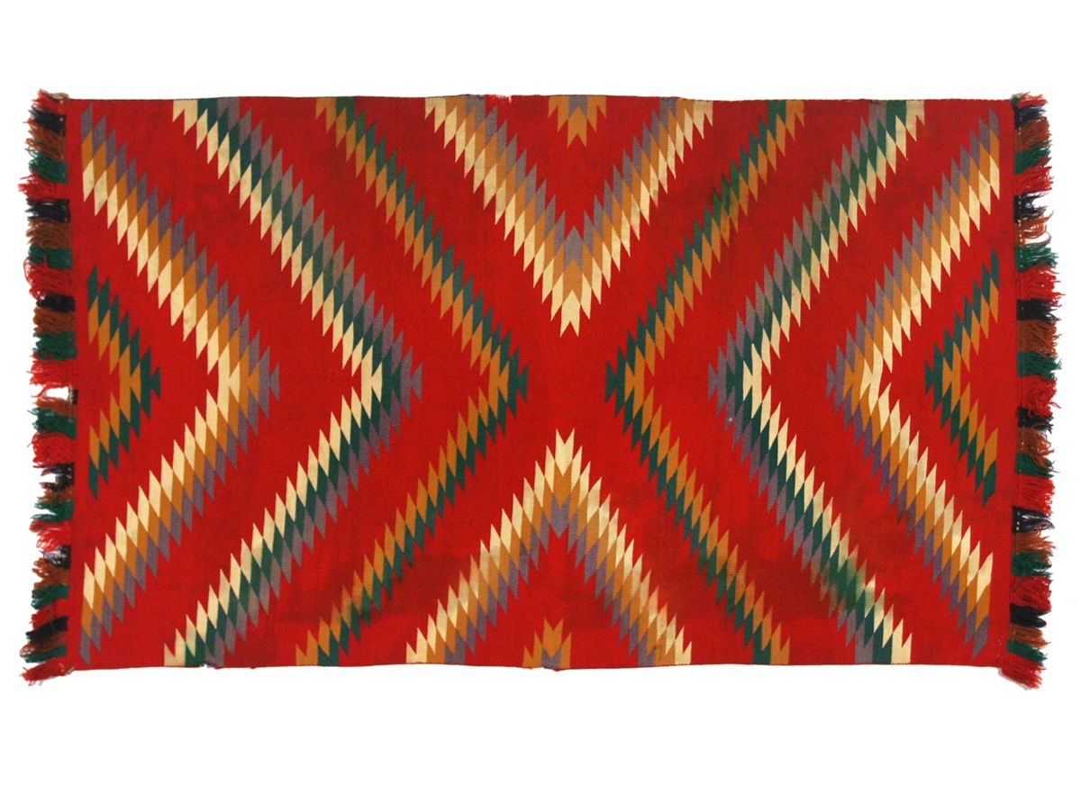 Navajo Weaving. 5'7" x 3'2". Germantown with vibrant eyedazzler designs consisting of multi-colored concentric, serrated pyramids on a red field. Circa 1890s.