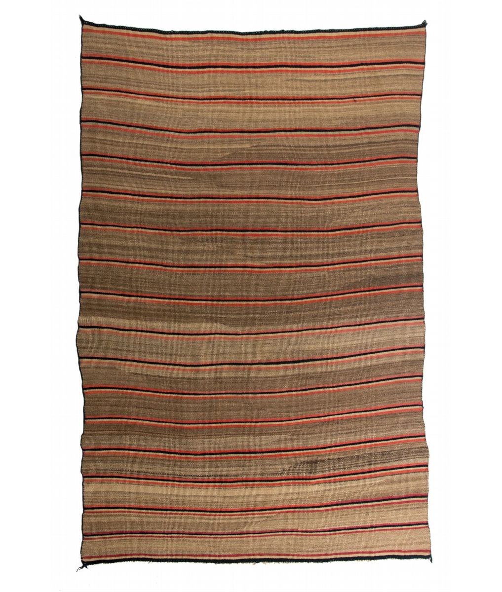 Navajo Weaving. 5'8" x 3'8". A soft, antique, woman's shawl/serape. Woven from silky, soft Spanish Churro long, staple wool and three-ply early Germantown and three-ply cochineal dyed Saxony or Germantown yarns. The blue stripes are all natural indigo dyed wool. All indigo blue selvage cords are original with no restoration. Circa 1870.
