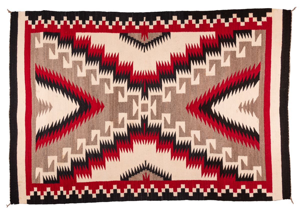 Navajo Weaving. 5'8" x 4'. A canvas-tight, intricately executed, old Indian rug. Fine latch hook and serrated elements form a large "X" pattern. The side borders are a delicate, checkered, meandering design merging into a triple end stripe. Woven from all Native, handspun, Churro cross sheep wool on a wool warp. Circa 1930s.