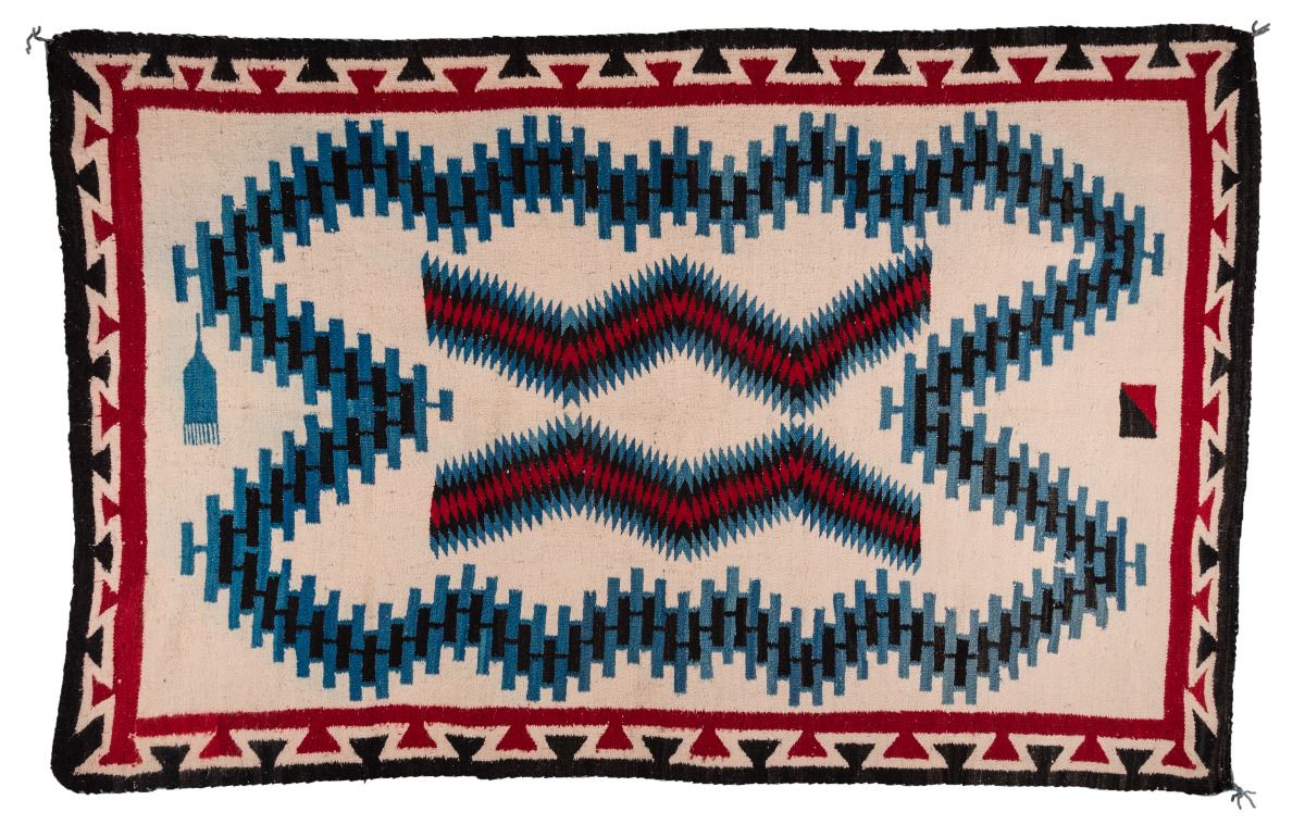 Navajo Weaving. 5'9" x 3'10". Western Reservation. Interesting, eye-dazzler designs highlighted in rare blue color. Some pictorial elements. Circa 1930s.