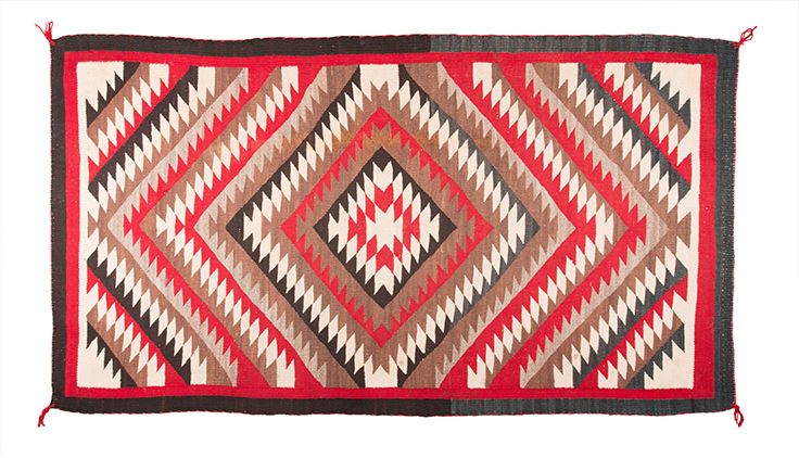 Navajo Weaving. 5'9" x 3'5". Ganado Area weaving, canvas-tight woven from Native handspun and hand-dyed, long staple Churro and Churro cross sheep wool. The design is an expanding, serrated diamond layout with a red and black ribbon border. Circa 1930's.