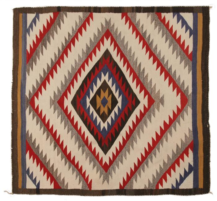 Navajo Weaving. 50" x 52 1/2". Eye dazzler design with scarce blue and mustard colors interspersed among white, gray, red and black background. Condition Report: Minor staining and some selvage damage.