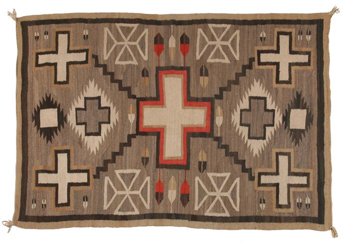 Navajo Weaving. 50" x 72 1/2". Pictorial designs of feathers and crosses. 1930s. Condition Report: Excellent condition.