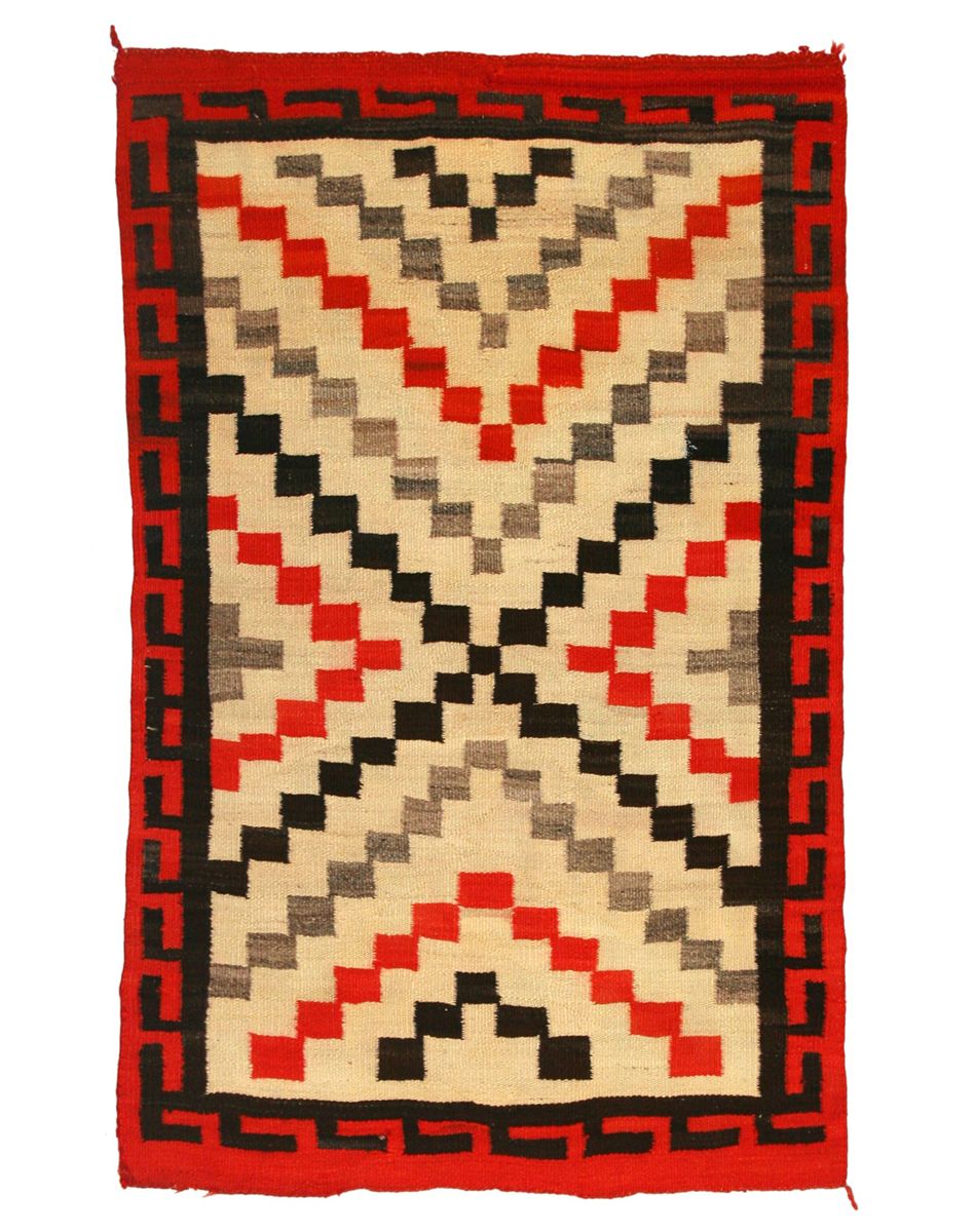 Navajo Weaving. 6'1" x 4' transitional weaving with stepped black, red and grey elements on a white background. Wide red border. Circa 1890s.