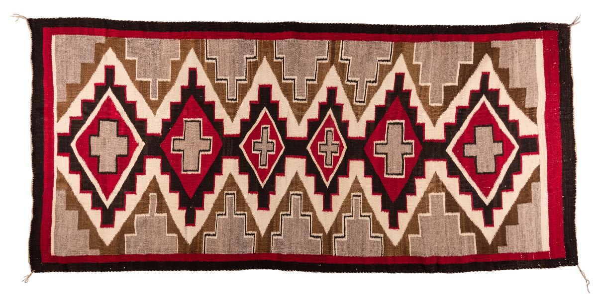 Navajo Weaving. 6'10" x 3'1". A very nice, old, Ganado runner with six Hubbell crosses aligned down the center; each in a stepped, concentric diamond. Woven from all Native, handspun, long-staple Churro sheep wool on a wool warp. Circa 1930s.