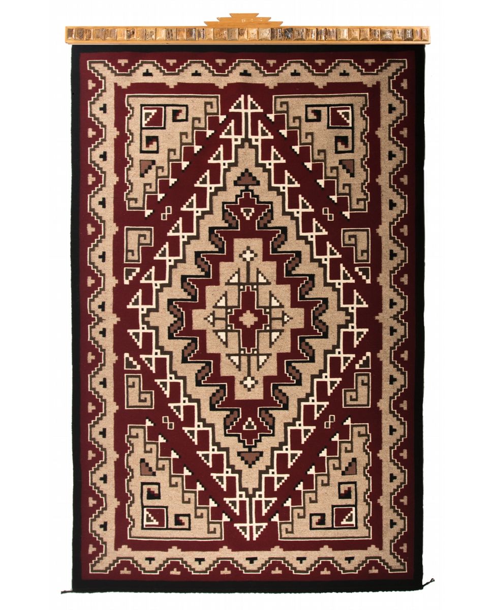 Navajo Weaving. 6'10" x 4'5". Ganado area, Two Grey Hills regional style. Intricate designs in a tight weave result in a spectacular weaving. Woven by Helen Allen Johnson. Contemporary. Includes 60" x 5.5" cactus wood rug hanger made in Chile. Certificate of appraisal and authenticity included in lot along with a photo of weaver holding rug.